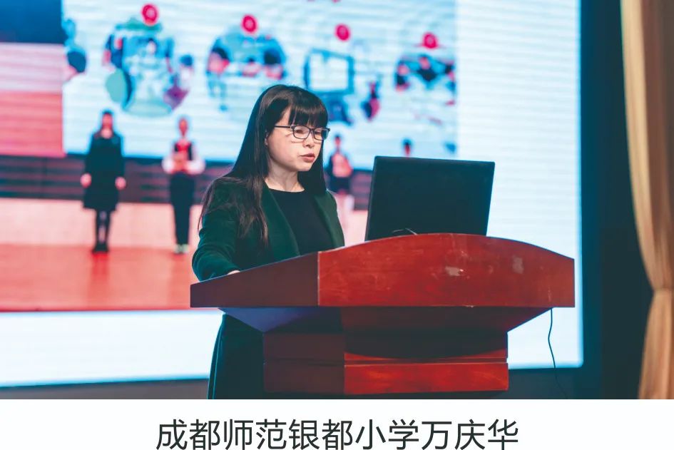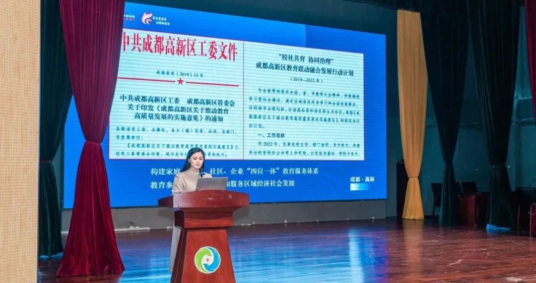 成都高新區(qū)菁蓉小學(xué)陳瓊副校長匯報(bào)的主題為《聚“鑄魂”工程 建“協(xié)創(chuàng)”系統(tǒng)——成都高新區(qū)菁蓉小學(xué)“家校社企”四位一體協(xié)同育人校本實(shí)踐》,展示了菁蓉小學(xué)在“協(xié)創(chuàng)教育”引領(lǐng)下,深度開展“家校社企”協(xié)創(chuàng)治理,落實(shí)“五育融合”,即學(xué)校、社區(qū)、企業(yè)及園區(qū)深度融通共育,提速提質(zhì)學(xué)校發(fā)展。
