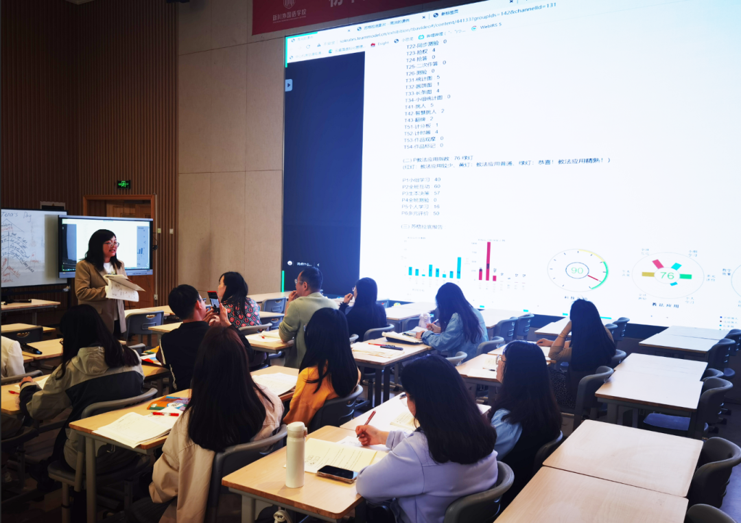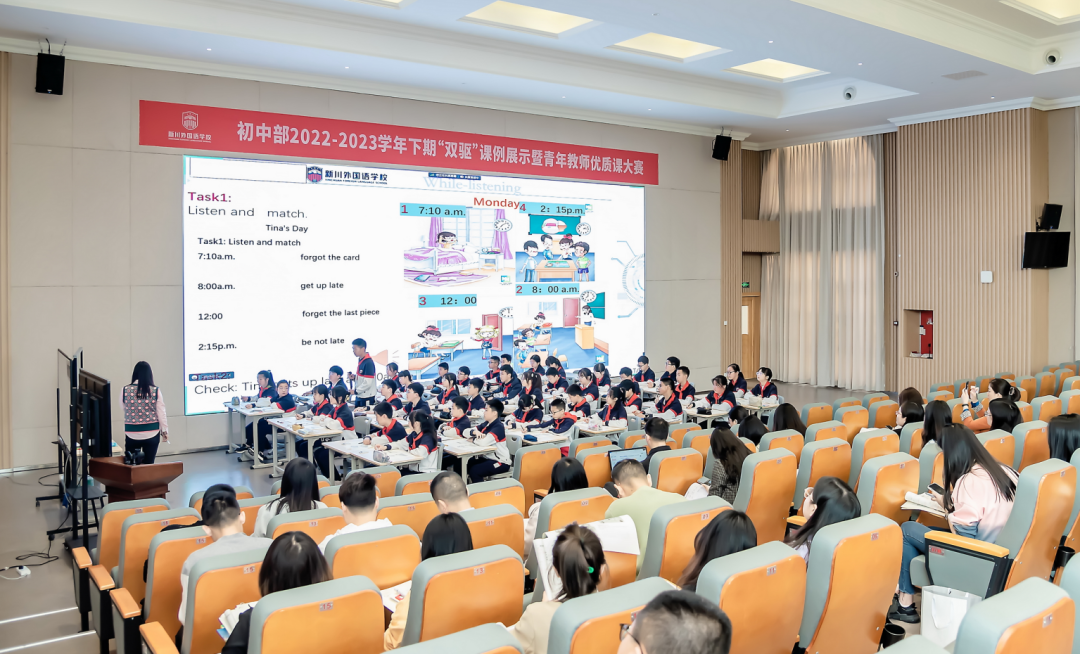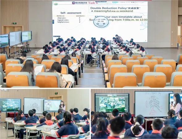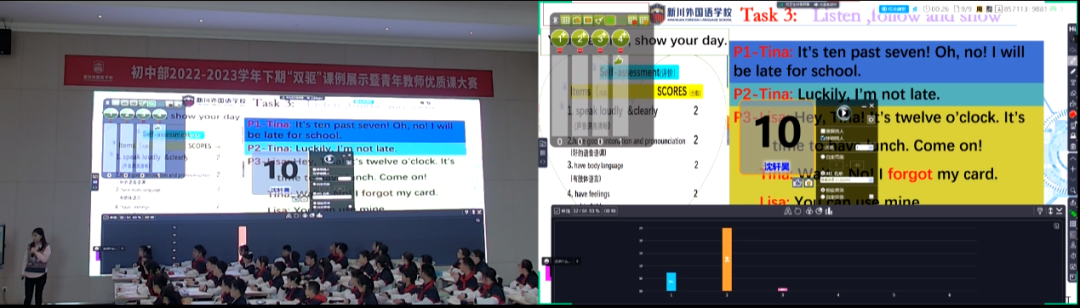 活動(dòng)現(xiàn)場,成都新川外國語學(xué)校教師白曉霞老師攜手新川外國語學(xué)校、中山中學(xué)七年級的孩子們共同完成《Tina's Day》一課,兩校英語組全體成員參與了此次活動(dòng)。白老師利用問題導(dǎo)入,激發(fā)學(xué)生學(xué)習(xí)興趣,讓學(xué)生更有參與感,倒計(jì)時(shí)精準(zhǔn)時(shí)間完成任務(wù),計(jì)分板競爭機(jī)制激發(fā)興趣,隨機(jī)挑人讓每位同學(xué)都有參與感,同時(shí)通過即問即答、數(shù)據(jù)分析精準(zhǔn)掌握兩地孩子們的學(xué)習(xí)情況。學(xué)生通過小組合作學(xué)習(xí),觀察現(xiàn)象、分析數(shù)據(jù)、得出結(jié)論,發(fā)展了學(xué)生的高階思維。