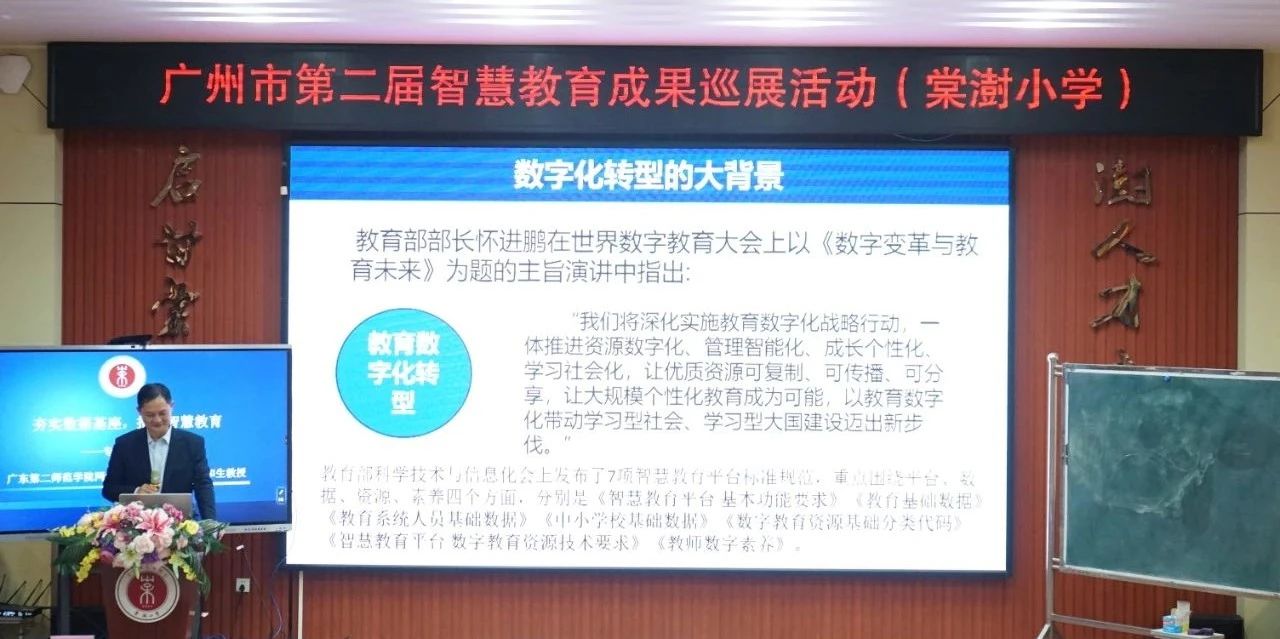 為落實黨的二十大關(guān)于“推進(jìn)教育數(shù)字化”的工作精神,根據(jù)廣東省關(guān)于建設(shè)國家課程數(shù)字教材全覆蓋的工作部署,以及廣州市建設(shè)“全國智慧教育示范區(qū)”的工作安排,及時總結(jié)和展示建設(shè)成果,3月29日,廣州市花都區(qū)新華街棠澍小學(xué)在花都區(qū)教育局和花都區(qū)教育發(fā)展研究院的指導(dǎo)下,舉行了“聚焦學(xué)情,共研共享”--廣州市第二屆智慧教育巡展暨花都區(qū)新華街棠澍小學(xué)智慧成果課堂特色展示活動。