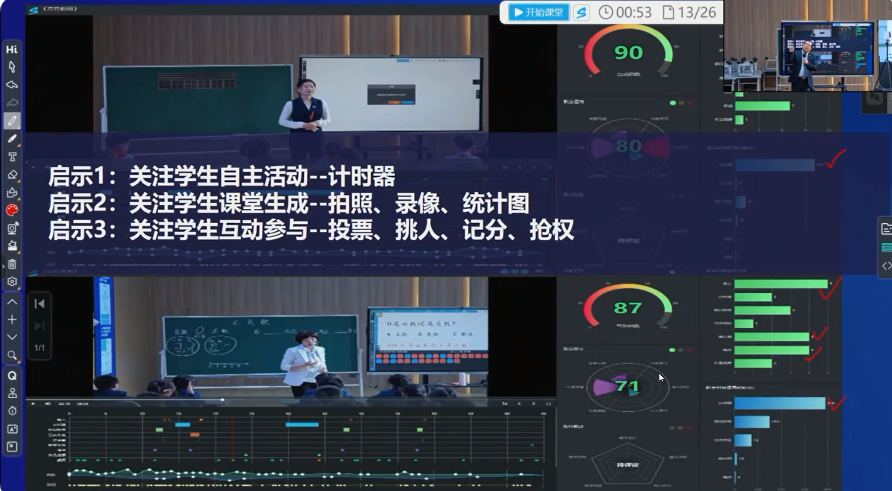 寶雞高新區(qū)教體局局長唐宏致辭,他指出,智慧教育是面向未來的教育模式,高新區(qū)教體局頂層設計,統(tǒng)籌部署,全力推進智慧教育發(fā)展,通過先進的信息化教育技術和智能化的學習平臺,推動教育教學的創(chuàng)新和升級,激發(fā)學生創(chuàng)造力,提高學生綜合素養(yǎng)。 上海金茂教育研究院院長程紅兵做題為《面向未來的教育是培養(yǎng)創(chuàng)造力的教育》的專題報告,他提出,面向未來的教育是培養(yǎng)創(chuàng)造力的教育,創(chuàng)造力的核心是想象力的培養(yǎng),而課程設計成為培養(yǎng)思維的關鍵,讓學生真實的學習才是教學價值的所在。 四川教育研究會教師發(fā)展專委會副理事長徐猛做題為《素養(yǎng)導向下的教什么與怎么教》的專題報告,關于“教”他給的建議是:越上位的觀念越具有統(tǒng)攝性,越上位的觀念越具有遷移性,教學要注重本身的學科性。不同的知識應該有不同的學習過程,高質量的學習沒有固定的教學模式。“教什么”和“怎么教”二者相互影響,相互促進。 在大會現(xiàn)場,寶雞高新第三小學王清老師、西南財經大學附屬實驗小學周靜老師、西寧市陽光小學張君君老師、珠海市香洲區(qū)第六小學宣立雨老師分別做了一堂智慧語文課、智慧數(shù)學課、智慧美術課和智慧科學課。老師們采用自主學習、合作探討等教學模式,激發(fā)學生的主動探索與知識共享,在HiTeach 5智慧教學系統(tǒng)賦能下的課堂,既關注到學生小組整體、組與組之間的差別,也關注到學生個體、個體和個體的表現(xiàn)差異,利用信息化技術真正做到了教學中對整體與個體的兼顧。 四位老師上課過程中,同步開啟智慧教研流程,觀摩老師和嘉賓通過掃碼即可進行議課評課。觀摩嘉賓可以通過多維度觀察課堂情況,以文字、照片、錄音、錄像方式記錄觀察重點內容,打破傳統(tǒng)紙筆記錄的限制,點評意見更加契合教學過程,授課教師能通過解讀系統(tǒng)中的生成性評價數(shù)據(jù)及其他教師的評語改進自身的課堂教學方法和教學策略,助力課堂教學質量的提高,提升自身專業(yè)成長。 劉彬教授帶來基于AI人工智能聯(lián)合教研的觀察報告,報告中,他從蘇格拉底平臺的AI評分,專家點評意見入手,從不同維度進行深入分析,肯定了老師們智慧教育手段的應用能力,展示了蘇格拉底平臺中各位專家,老師的點評意見,提煉了聽課評課的最佳有效方式,希望在AI人工智能的加持下,區(qū)域智慧教育持續(xù)“起飛”~ 本次活動聯(lián)合寶雞、成都、西寧、珠海四地學校,以智慧課堂為抓手,共同探索研究“智慧教研、智慧課堂、智慧評價”等利用人工智能、大數(shù)據(jù)的現(xiàn)代教育技術,助推教師專業(yè)成長,培養(yǎng)學生全面發(fā)展,打造“課堂文化發(fā)展”品牌,推進各區(qū)域內學校高質量發(fā)展。