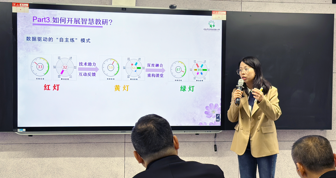成都師范銀都紫藤小學(xué)宋雪麗副主任通過“智慧課堂、智慧教研、教師發(fā)展、聯(lián)盟服務(wù)”四個維度進(jìn)行專題報告。紫藤小學(xué)深耕智慧教育八年,通過數(shù)字化賦能,構(gòu)建了“一核四環(huán)”教師成長體系,促進(jìn)教師個性化高效發(fā)展;形成了“五步三環(huán)”智慧課堂模式,實現(xiàn)教學(xué)方式轉(zhuǎn)變;探索師生數(shù)字畫像,推動教育評價變革。