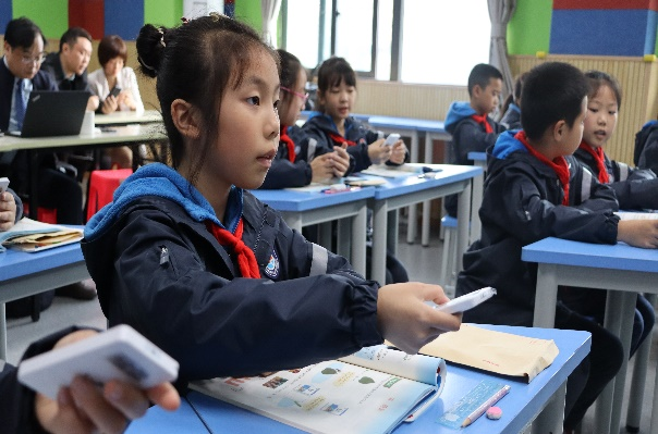 我校智慧課堂建設(shè)主要依托醍摩豆HiTeach互動(dòng)教學(xué)平臺和IRS反饋器,老師們將信息技術(shù)充分運(yùn)用到了教、學(xué)、評,利用IRS反饋器實(shí)現(xiàn)課前精準(zhǔn)預(yù)測,課中實(shí)時(shí)反饋,課后及時(shí)檢測的高效課堂。目前學(xué)?;緦?shí)現(xiàn)了二三四年級全覆蓋,學(xué)生人手一個(gè)反饋器。這套設(shè)備在一定程度上解決了當(dāng)下課堂評價(jià)數(shù)據(jù)反饋不及時(shí)、以評定教不精準(zhǔn)的現(xiàn)象。一所新學(xué)校有很多校園文化打造的地方需要大量經(jīng)費(fèi)投入,但是在經(jīng)費(fèi)非常緊張的情況下我們花費(fèi)了將近100萬打造了40間智慧教室,可以看出學(xué)校領(lǐng)導(dǎo)在課堂教學(xué)改革的決心,因此學(xué)校的總目標(biāo)就是會(huì)用、常用、用好,要不再好的設(shè)備也只是一堆廢鐵。