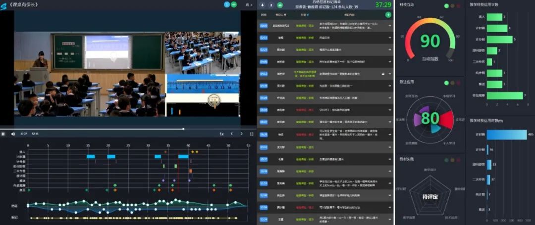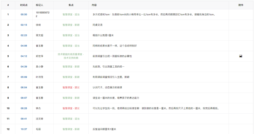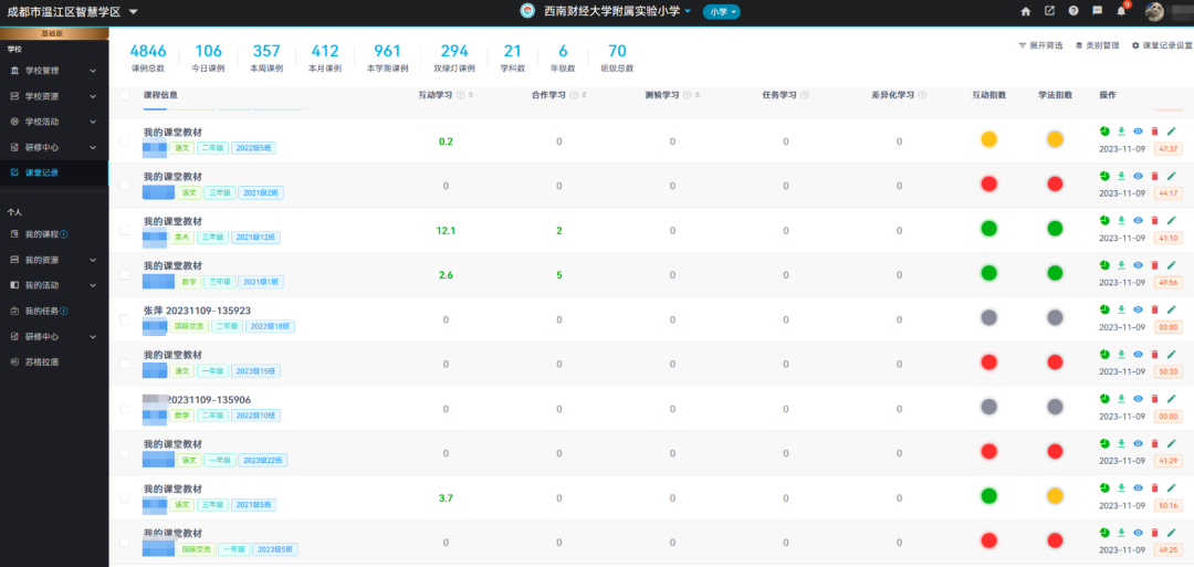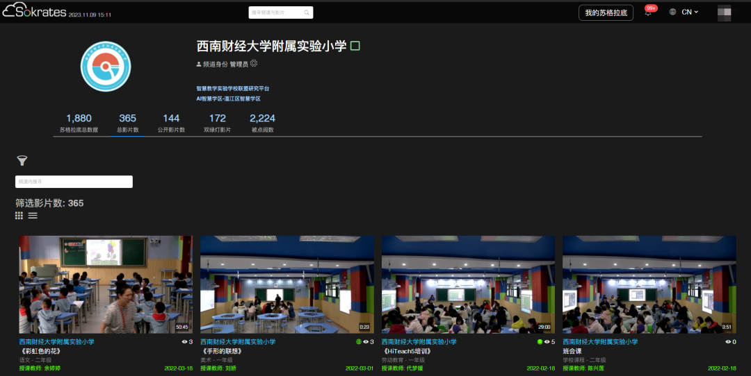 除此以外,在AI平臺上,每節(jié)課還有具體的教師行為分析,對應(yīng)著有各種各樣的技術(shù)應(yīng)用,什么時(shí)候使用了什么技術(shù),都標(biāo)記的非常清楚,為其他聽課老師在學(xué)習(xí)技術(shù)使用時(shí)提供了便捷的操作,快速定位學(xué)習(xí)這項(xiàng)技術(shù)可以在課堂的什么環(huán)節(jié)進(jìn)行運(yùn)用,為技術(shù)的使用復(fù)刻提供有效方法。經(jīng)過學(xué)習(xí)、實(shí)踐、反思、調(diào)整到再實(shí)踐的過程有效掌握技術(shù)運(yùn)用,有效學(xué)習(xí)教法運(yùn)用,這也是學(xué)校培養(yǎng)青年教師的寶貴資源,解決了教師學(xué)習(xí)時(shí)間和空間難統(tǒng)一的問題,利用線上資源自定步調(diào)開展學(xué)習(xí),為教師專業(yè)成長提供多元路徑。其次記錄的課堂實(shí)錄還可以邀請專家評委觀看并進(jìn)行評價(jià)打點(diǎn)記錄,特別是前兩年新冠期間,專家不能到現(xiàn)場聽課指導(dǎo),他們就可以通過觀看課堂實(shí)錄的方式進(jìn)行文字記錄,通過線上會(huì)議開展指導(dǎo),打破指導(dǎo)的時(shí)間和空間限制,讓教研更泛在。 資源庫建設(shè)也是學(xué)校智慧課堂和智慧教研推進(jìn)的重要舉措,共建共享的資源是全體教師的智慧結(jié)晶,也是教師學(xué)習(xí)和成長的源泉。學(xué)校結(jié)合各類賽課活動(dòng)、教研活動(dòng)等逐步豐富西財(cái)附小頻道的課例資源。 總影片數(shù)365,雙綠燈影片172,被點(diǎn)閱數(shù)2224。同課異構(gòu)、同課同構(gòu)、復(fù)習(xí)課、新授課等類型多樣,為教師的學(xué)習(xí)提供豐富資源。 結(jié)合集體備課智慧眾籌,各學(xué)科教學(xué)資源逐漸完善:課件、教學(xué)設(shè)計(jì)、作業(yè)設(shè)計(jì)、課堂實(shí)錄鏈接等,為教師的使用提供便捷。