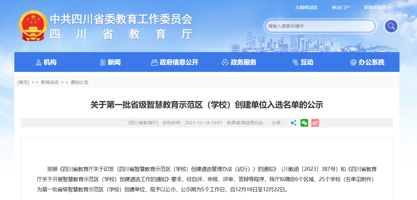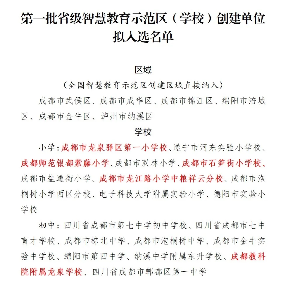 近日,四川省教育廳公布第一批省級智慧教育示范區(qū)(學校)創(chuàng)建項目名單,公布了6個區(qū)域,25個學校作為四川省首批省級智慧教育示范區(qū)(學校)。
