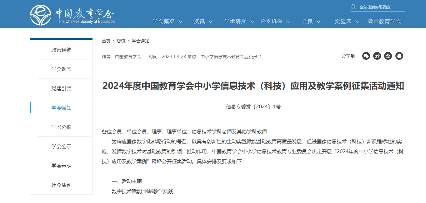 4月底,中國教育學(xué)會(huì)發(fā)布通知,開展2024年度中國教育學(xué)會(huì)中小學(xué)信息技術(shù)(科技)應(yīng)用及教學(xué)案例征集活動(dòng)。