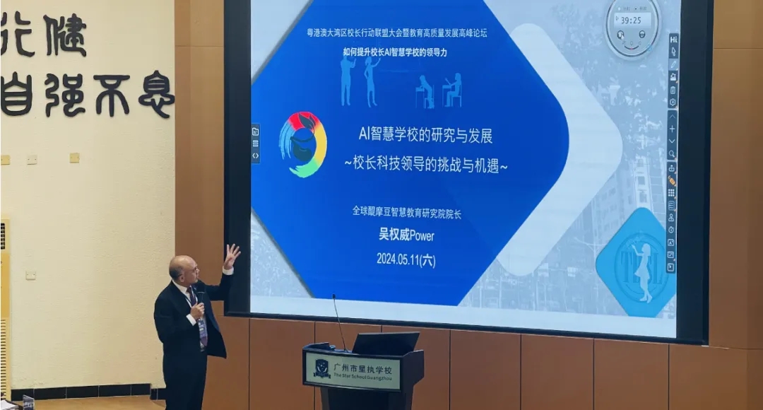 5月11日,粵港澳大灣區(qū)校長行動(dòng)聯(lián)盟大會(huì)暨教育高質(zhì)量高峰論壇在廣州市星執(zhí)學(xué)校盛大舉行,醍摩豆智慧教育研究院院長吳權(quán)威教授受邀出席本次論壇,并作“如何提升校長AI智慧學(xué)校的領(lǐng)導(dǎo)力”主題報(bào)告分享。醍摩豆智慧教育研究院秘書長劉彬教授陪同參加。