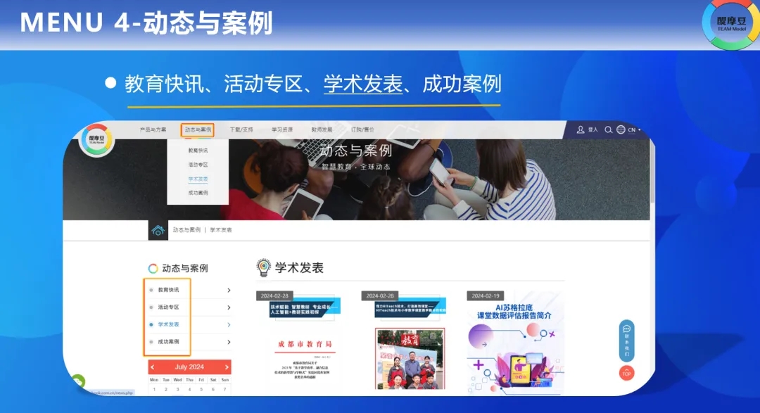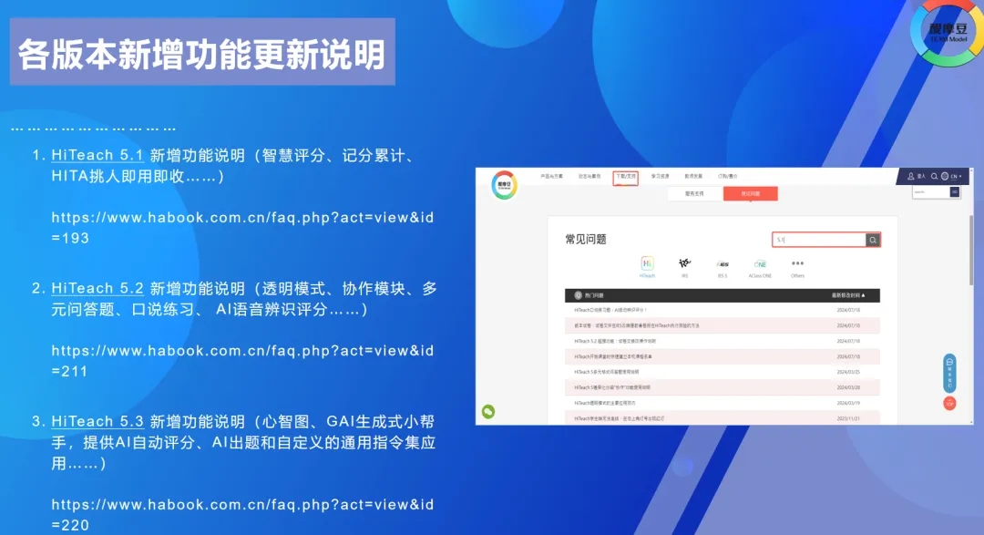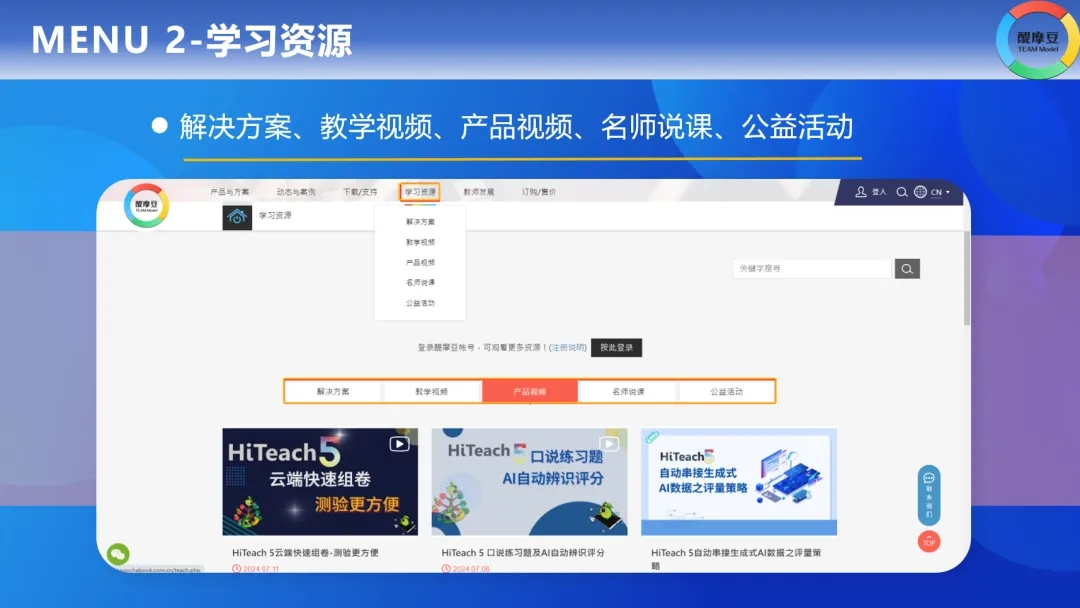 醍摩豆官網(wǎng)詳盡展示了教學(xué)研管評(píng)一體化的系列產(chǎn)品、解決方案、典型案例、操作流程等內(nèi)容,老師們可以在這里下載HiTeach相關(guān)的各類軟件,了解每一款產(chǎn)品的功能特色及應(yīng)用場景,為選擇最適合自己教學(xué)需求的解決方案提供參考。遇到疑問也可以在QA部分找到對(duì)應(yīng)的解決方案,以及每個(gè)版本新增功能的特別說明。同時(shí),我們特別開通教師學(xué)習(xí)專區(qū),羅列了解決方案、教學(xué)視頻、產(chǎn)品視頻、名師說課、公益活動(dòng)等內(nèi)容,老師們可以按需取用。