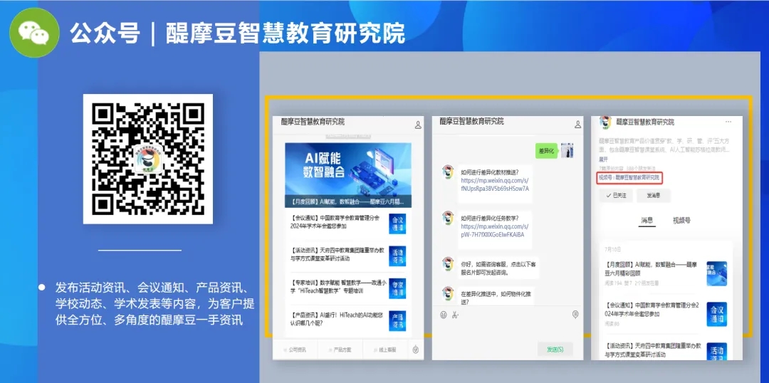 微信公眾號(hào):醍摩豆智慧教育研究院。這里,是獲取醍摩豆最新動(dòng)態(tài)的一站式窗口。我們精心策劃并發(fā)布各類活動(dòng)資訊、會(huì)議通知,讓您第一時(shí)間掌握行業(yè)盛事;產(chǎn)品資訊詳盡全面,助您深入了解醍摩豆智慧教育解決方案的最新進(jìn)展;學(xué)校動(dòng)態(tài)頻傳,分享合作學(xué)校的變革故事與成功實(shí)踐;更有學(xué)術(shù)發(fā)表精選,匯聚教育智慧,啟迪未來教育之路。我們致力于為客戶提供全方位、多角度的醍摩豆一手資訊,助力教育創(chuàng)新與發(fā)展。