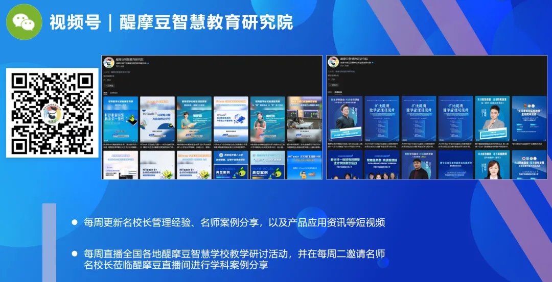 在視頻號(hào),我們實(shí)時(shí)更新名校長管理經(jīng)驗(yàn)分享,讓您近距離感受教育領(lǐng)袖的智慧與風(fēng)采;名師案例生動(dòng)呈現(xiàn),將教學(xué)藝術(shù)與教學(xué)成果直觀展現(xiàn);產(chǎn)品應(yīng)用資訊速遞,帶您領(lǐng)略醍摩豆智慧教育產(chǎn)品的實(shí)際應(yīng)用與成效。此外,我們還直播全國各地醍摩豆智慧學(xué)校的教學(xué)研討活動(dòng),讓您仿佛置身現(xiàn)場,與眾多教育同仁共襄盛舉。同時(shí)每周二晚,視頻號(hào)特別邀請(qǐng)名師名校長蒞臨醍摩豆直播間,進(jìn)行深度學(xué)科案例分享,為您帶來前所未有的學(xué)習(xí)體驗(yàn)與靈感碰撞。