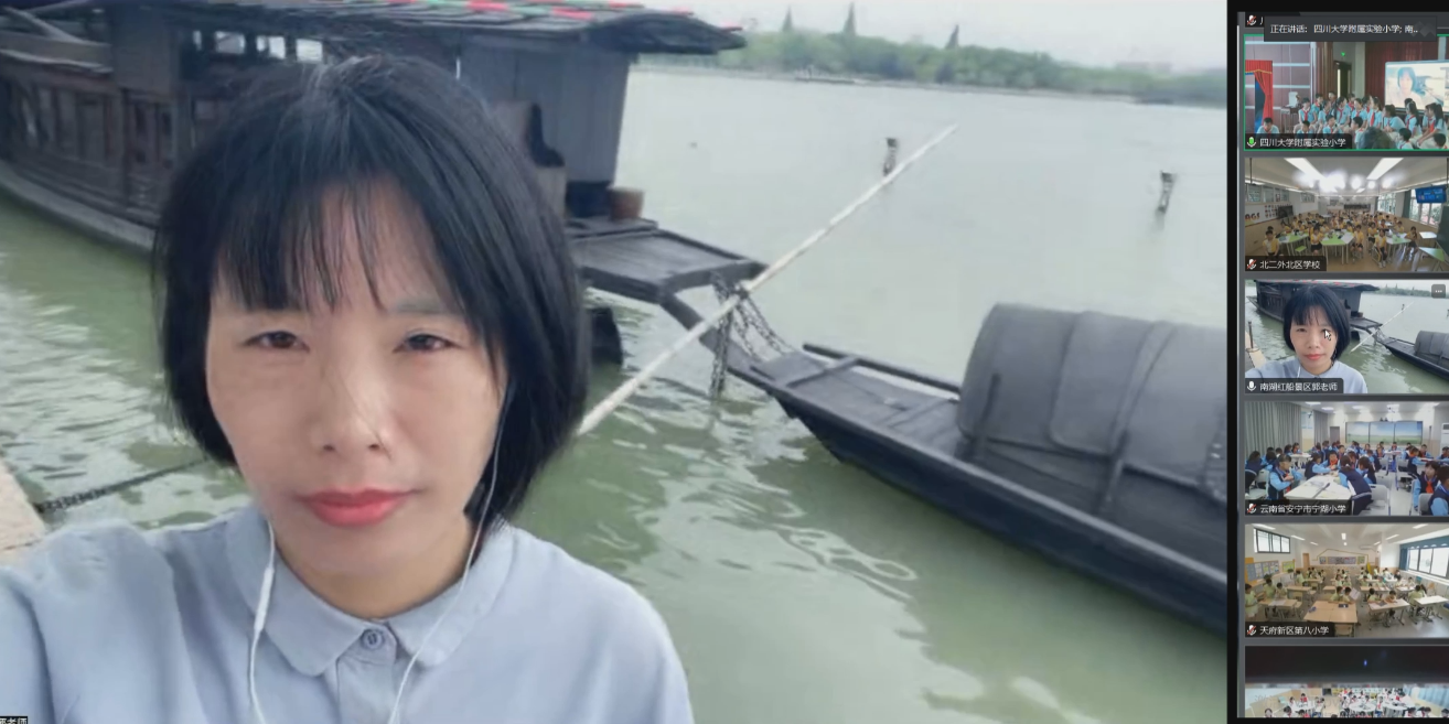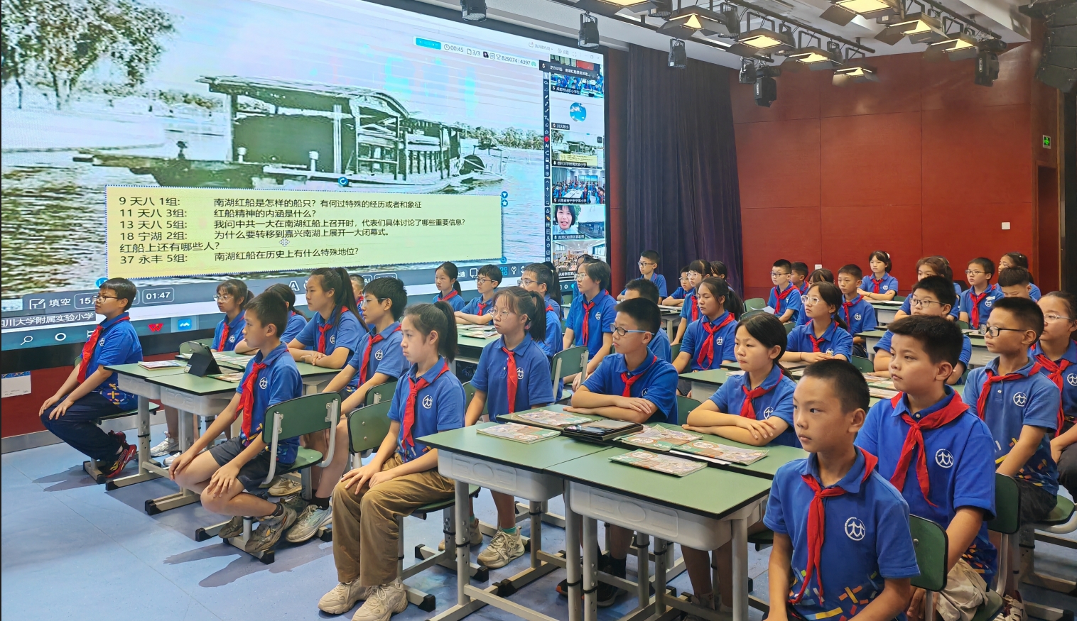 教學中,嘉興南湖紅船真實場景的介入,不斷碰撞感悟:“紅船雖小,卻承載著改變中國的力量!”當嘉興南湖革命紀念館的講解聲穿越時空抵達課堂,四川大學附屬實驗小學與共建學校的同學們通過云端“走進”紅船景區(qū)。在數(shù)智技術構建的立體課堂中,黨的誕生史從書本躍然眼前。同學們與講解員實時對話,在時空交疊的互動中,讀懂了紅船為何能承載“開天辟地”的千鈞重量。