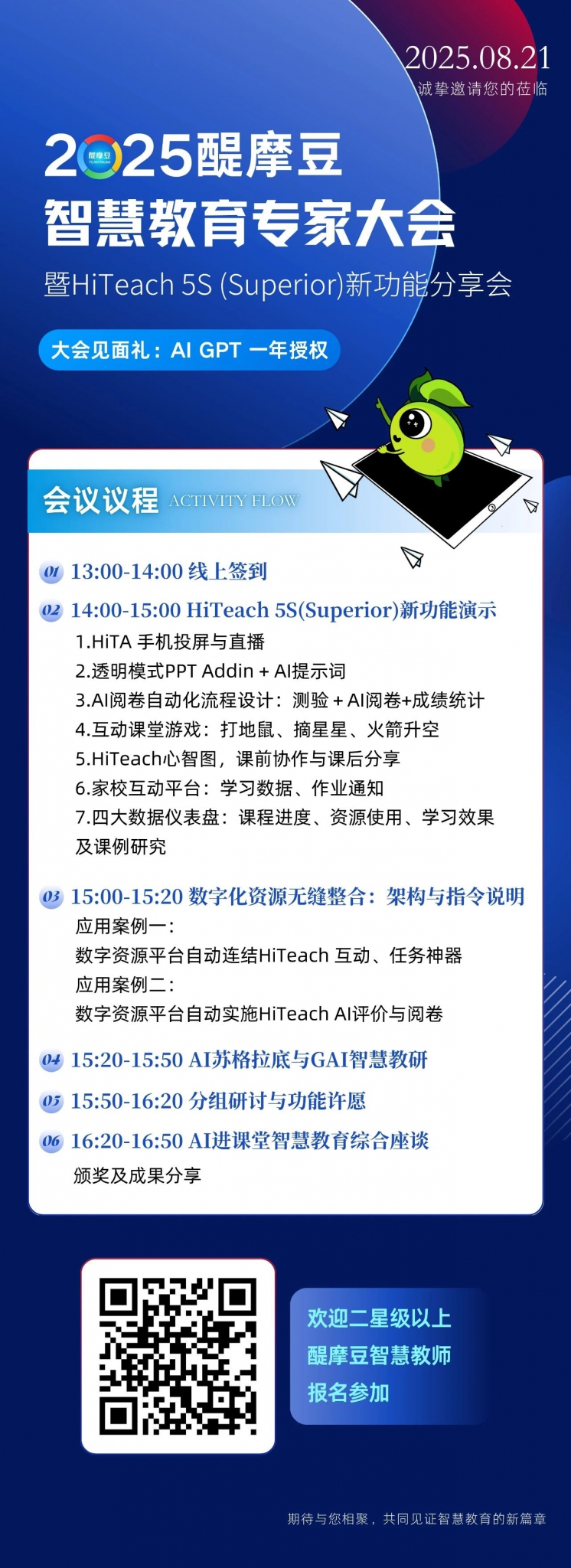 為全方位展示過去一年里生成式人工智能(AI)深度賦能下的優(yōu)質(zhì)課例與教學(xué)創(chuàng)新案例,全面呈現(xiàn)新產(chǎn)品 HiTeach 5S (Superior) 的卓越新功能與巨大價值,醍摩豆精心籌備,擬定于 2025 年 8 月 21 日(周四)通過線上的方式舉辦“醍摩豆專家大會暨 HiTeach 5S(Superior) 新功能分享會”。大會將重磅發(fā)布第五代標(biāo)桿產(chǎn)品 HiTeach 5S Superior 版本。它能在數(shù)字化資源服務(wù)上實(shí)現(xiàn)重大突破,無縫整合各類電子教材與數(shù)字資源,一鍵啟動多樣化學(xué)習(xí)任務(wù),同時,大會將深入介紹 HiTeach AI 設(shè)計自動化測驗(yàn)與 AI 批閱流程的方法。 HiTeach 5S Superior 版本具有操作簡便、功能強(qiáng)大、整合度高,能大幅減輕教師教學(xué)評價負(fù)擔(dān),提升學(xué)業(yè)水平,是老師新學(xué)期必不可少的數(shù)智化教學(xué)工具。 打開HiTA APP,點(diǎn)擊主頁,即可查看您的星級類別 在此,我們誠摯地歡迎醍摩豆智慧學(xué)校的領(lǐng)導(dǎo)、教師們積極報名參與本次大會。我們期待與您相聚在 8 月 21 日的線上盛會,共同見證 HiTeach 5S Superior 版本的驚艷亮相,共同探索數(shù)智教育的無限可能,共同開啟教育新時代的美好篇章!
