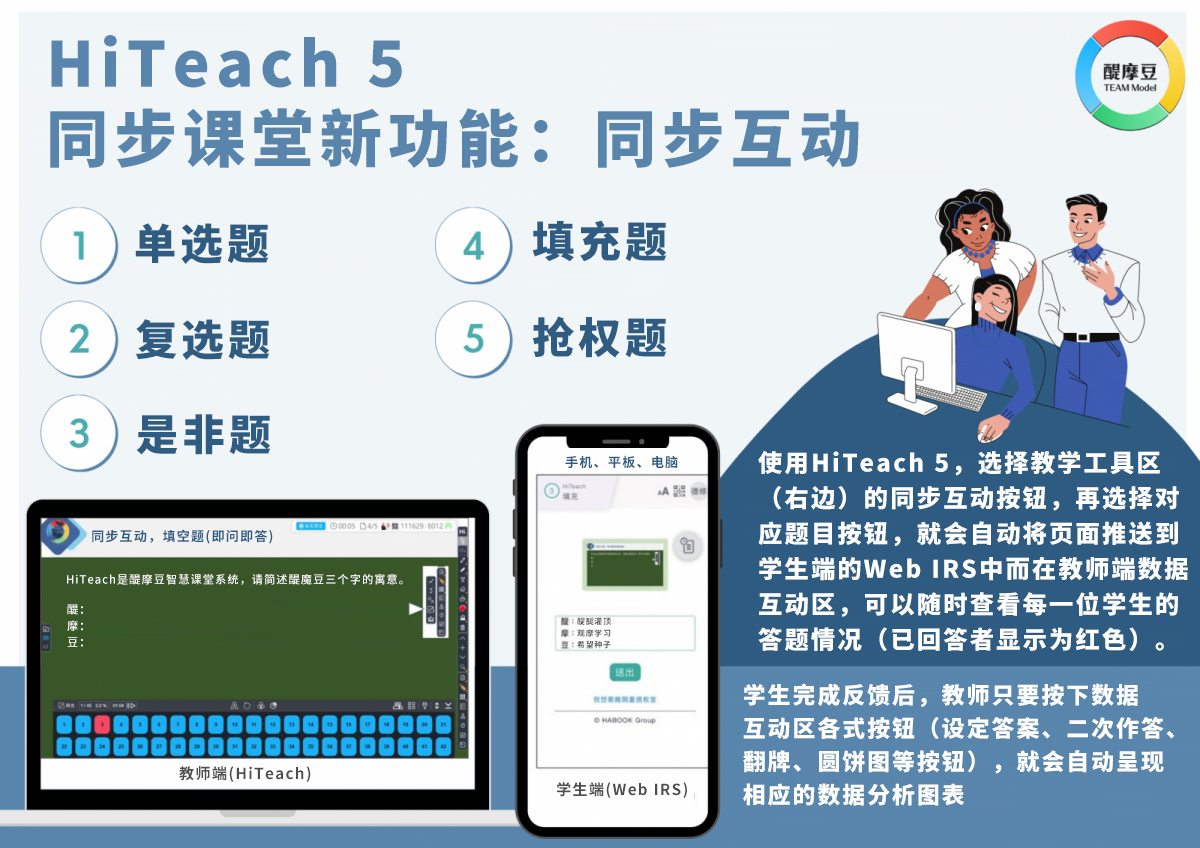 同步測驗:結束一段教學主題后,測驗,是總結學習成果,知強補弱的好方法!在智慧教室里,利用HiTeach的測驗模式功能,選擇IES云端共備或個人的試卷,即可讓學生透過實時反饋裝置進行作答,教學過程整合階段型成果測驗,是最完美總結一堂課的好方法。