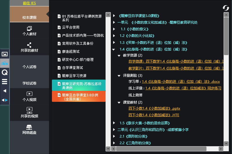 一個健全的資源平臺將有助于學(xué)?;蚴墙逃龁挝唤⑾到y(tǒng)化的課程體系,實現(xiàn)資源共建、共備與共享的理想。如醍摩豆智慧教育系統(tǒng)中發(fā)展出「校本課綱」建構(gòu)模式,包容多元的教學(xué)資源匯整,如文件、圖片、音頻、影片格式的教材;提煉翻轉(zhuǎn)課堂的自學(xué)模式,以影片連結(jié)(Youtube、均一平臺、 Web ),結(jié)合在線互動功能,安排學(xué)生評量測驗,搭配在線回覆的功能,可依據(jù)學(xué)生的學(xué)習(xí)評量結(jié)果,提供學(xué)生不同需求的學(xué)習(xí)輔導(dǎo)與補(bǔ)教教材。善用平臺以規(guī)劃校本特色課程,便于學(xué)校進(jìn)行資源的典藏,使教學(xué)成果可視化;教師社群之間可共同備課、集結(jié)智慧、整合資源,并且將課前、課中、課后資源完整記錄;也透過賬號的整合,可以使得跨校合作交流上的編輯、分享、共享課綱資源更加便利。這些共享的云端教學(xué)資源可于智慧教室中直接匯入或下載,將云和端的完整對接,是互聯(lián)網(wǎng)下的教育創(chuàng)新。 醍摩豆智慧教育系統(tǒng)中發(fā)展出「校本課綱」方便教師取用在線資源