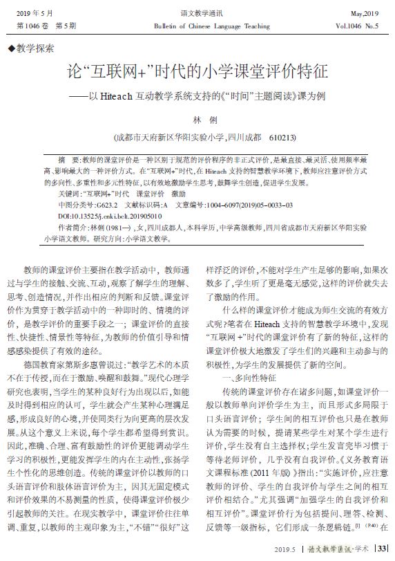 成都市天府新區(qū)華陽實驗小學林俐老師論文《論”互聯(lián)網(wǎng)+”時代的小學課堂評價特征-以Hiteach互動教學系統(tǒng)支持的「”時間”主題閱讀」課為例》收錄于中國學術期刊《語文教學通訊》2019年5月,第1046 卷第5 期。