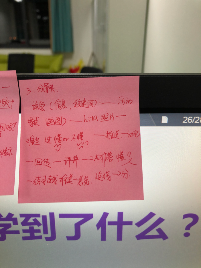 兩節(jié)課雖已結(jié)束,但成長才剛剛起步。痛定思痛,我在反思自己和黃校長的差距是什么?是課堂調(diào)控能力、是教材解讀水平、是教學(xué)智慧、是以生為本的教育理念、是為需而言深度融合的技術(shù)觀......太多太多,而其中哪一些是我需要時間沉淀積累的,而哪一些是我可以快速模仿學(xué)會的?同課同構(gòu)點(diǎn)亮了前行的方向。我在蘇格拉底平臺上反復(fù)觀摩黃校長的智慧課,記錄每一個環(huán)節(jié),思考每一個問題。為什么這樣提問?為什么這個環(huán)節(jié)這樣設(shè)計?一字一句形成了我自己的心得筆記,根據(jù)新的備課,再磨課再反思再上課。