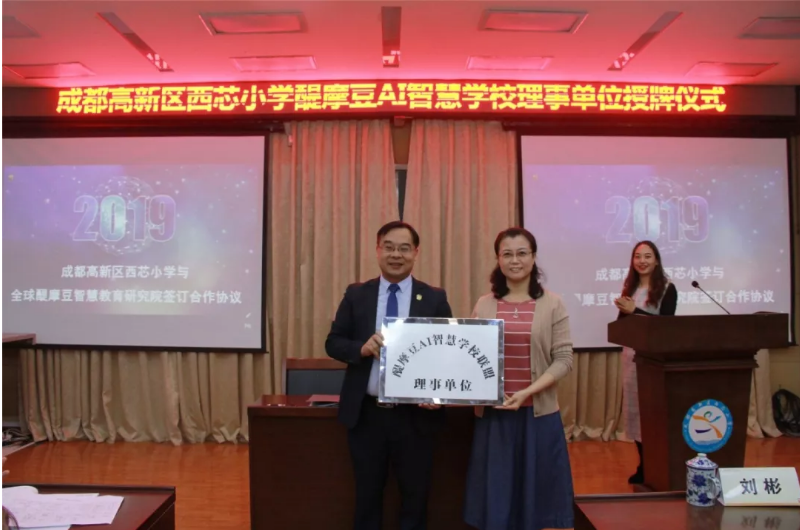 之后,由劉彬校長親自授牌成都高新區(qū)西芯小學“醍摩豆AI智慧學校聯(lián)盟理事單位”牌匾。