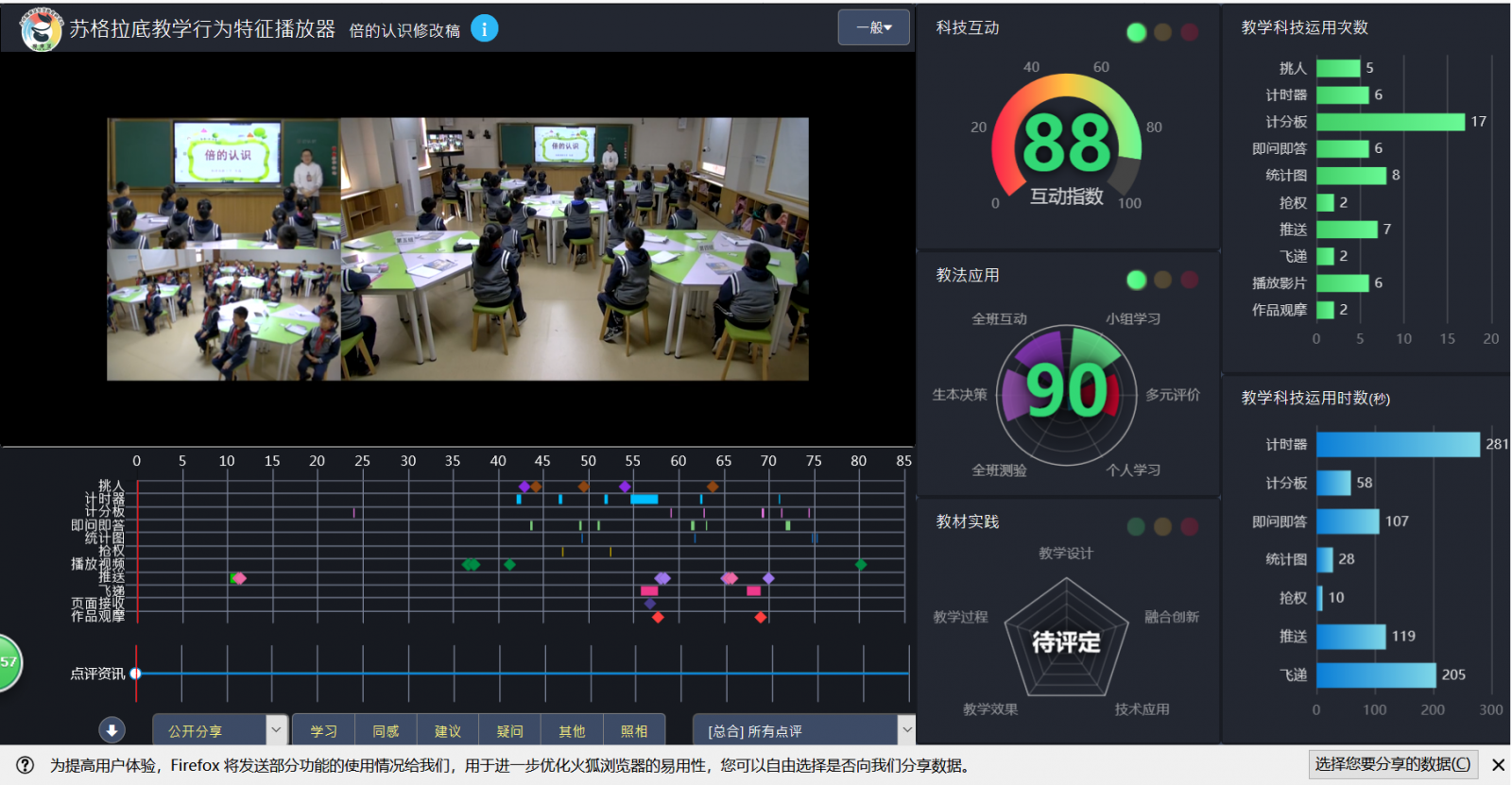 新課開始通過(guò)學(xué)生獨(dú)立思考并借助IRS反饋器讓學(xué)生猜測(cè)蘋果和桃子的倍數(shù),智慧挑人讓不同選項(xiàng)數(shù)出理由,從學(xué)生已有知識(shí)和經(jīng)驗(yàn)出發(fā),在辨析中加深學(xué)生對(duì)概念的理解。倍數(shù)拓展部分采用的是小組合作的方式,各小組將自己的想法上傳至作品觀摩區(qū),通過(guò)投票選舉,讓學(xué)生選擇自己感興趣部分內(nèi)容,引發(fā)學(xué)生想象3倍、4倍等,學(xué)會(huì)對(duì)知識(shí)的遷移,使倍的知識(shí)理解的更透徹。本節(jié)課十分注重學(xué)生的評(píng)價(jià),在計(jì)分板中不僅有學(xué)生知識(shí)方面獲得的肯定,還有學(xué)習(xí)習(xí)慣方面的嘉獎(jiǎng)。通過(guò)對(duì)各小組的評(píng)價(jià),我從學(xué)生的實(shí)際學(xué)情出發(fā),根據(jù)各小組的得分情況進(jìn)行分組推送練習(xí)題,滿足了不同學(xué)生對(duì)本節(jié)課的需求。