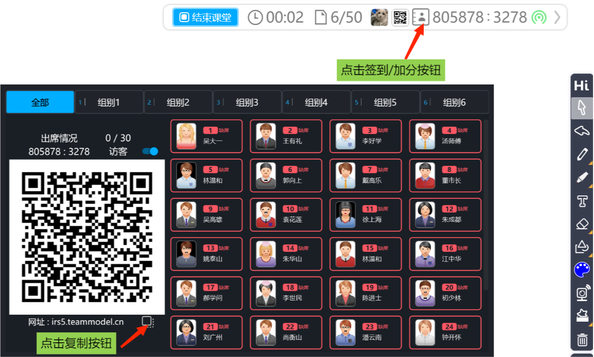 在開始課堂之后,正式上課前,可以先點選HiTeach的簽到/加分按鈕,接著點選復(fù)制鈕,復(fù)制本次課堂的超連結(jié)后,以通訊軟件或其他機制將超連結(jié)貼給學(xué)生們,直接用此連結(jié)連線,斷線也可以重新連。