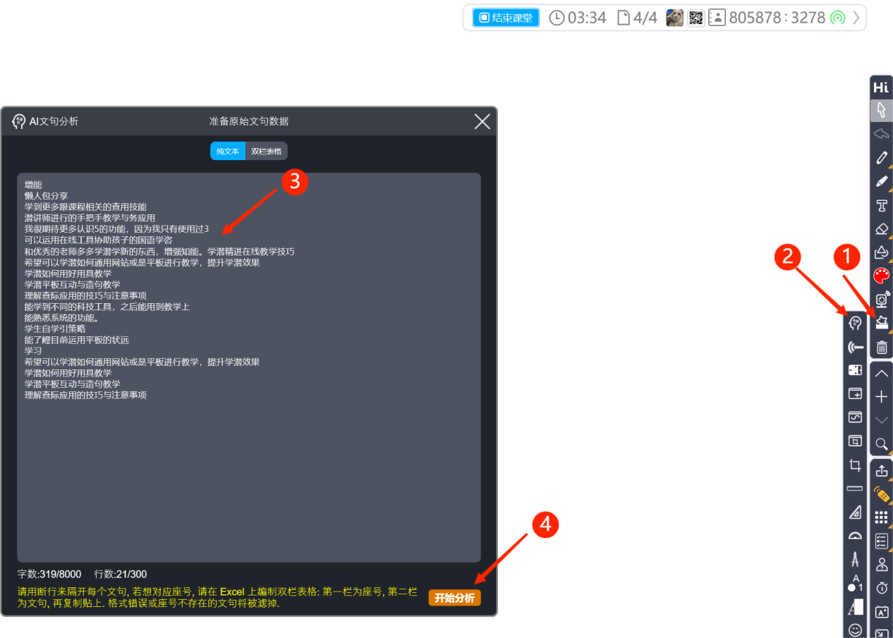 2.在HiTeach 5點選教具鈕,在教具區(qū)點選AI文句分析鈕,顯示原始文句輸入視窗后,在欄位中貼上文字(鍵盤快捷鍵:Ctrl + V),然后選擇開始分析鈕。