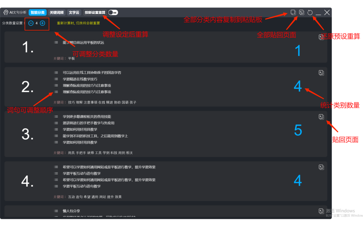 3.隨即顯示AI文句分析視窗,顯示AI分析整理的結果。預設顯示智慧分類標簽,可以看到自動分類的詞句,以及每個類別的數(shù)量。HiTeach所提供的分析功能還非常具有彈性,允許使用者將文句調整分類,或者增減分類的數(shù)目,然后讓AI重新計算。