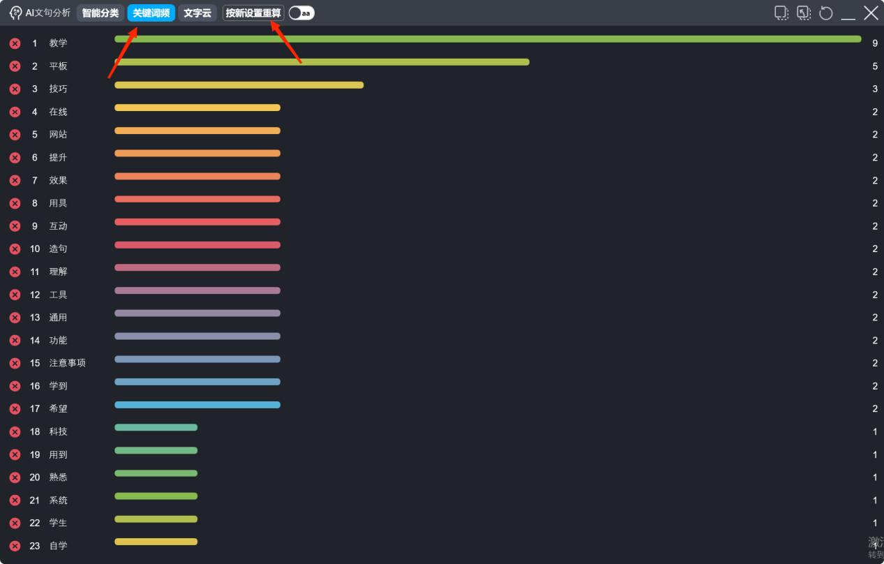 4.點選關鍵詞頻標簽,會顯示關鍵詞的出現(xiàn)頻次統(tǒng)計長條圖,以及數(shù)量,同樣可以自主刪除關鍵詞,然后讓AI重新計算。