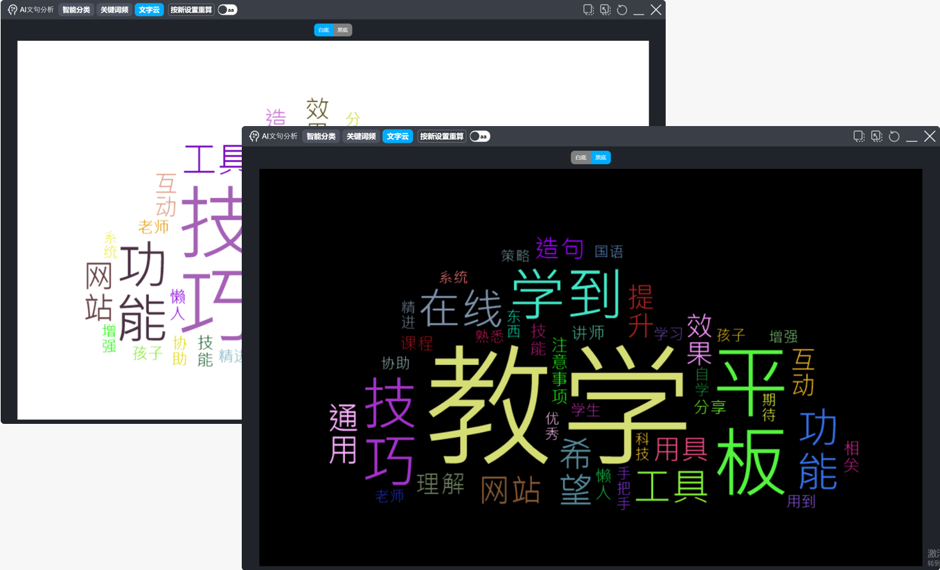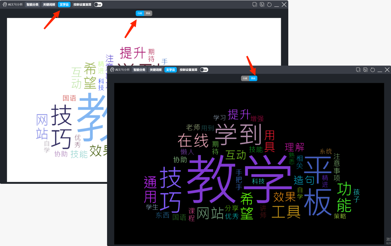 5.點選文字云標簽,則會將關鍵詞依照頻次多寡,以文字大小與顏色的分別,組成云狀圖,便于教師不同的呈現(xiàn)需求與教學應用。系統(tǒng)提供使用者選擇白底背景或者黑底背景樣式來呈現(xiàn)。