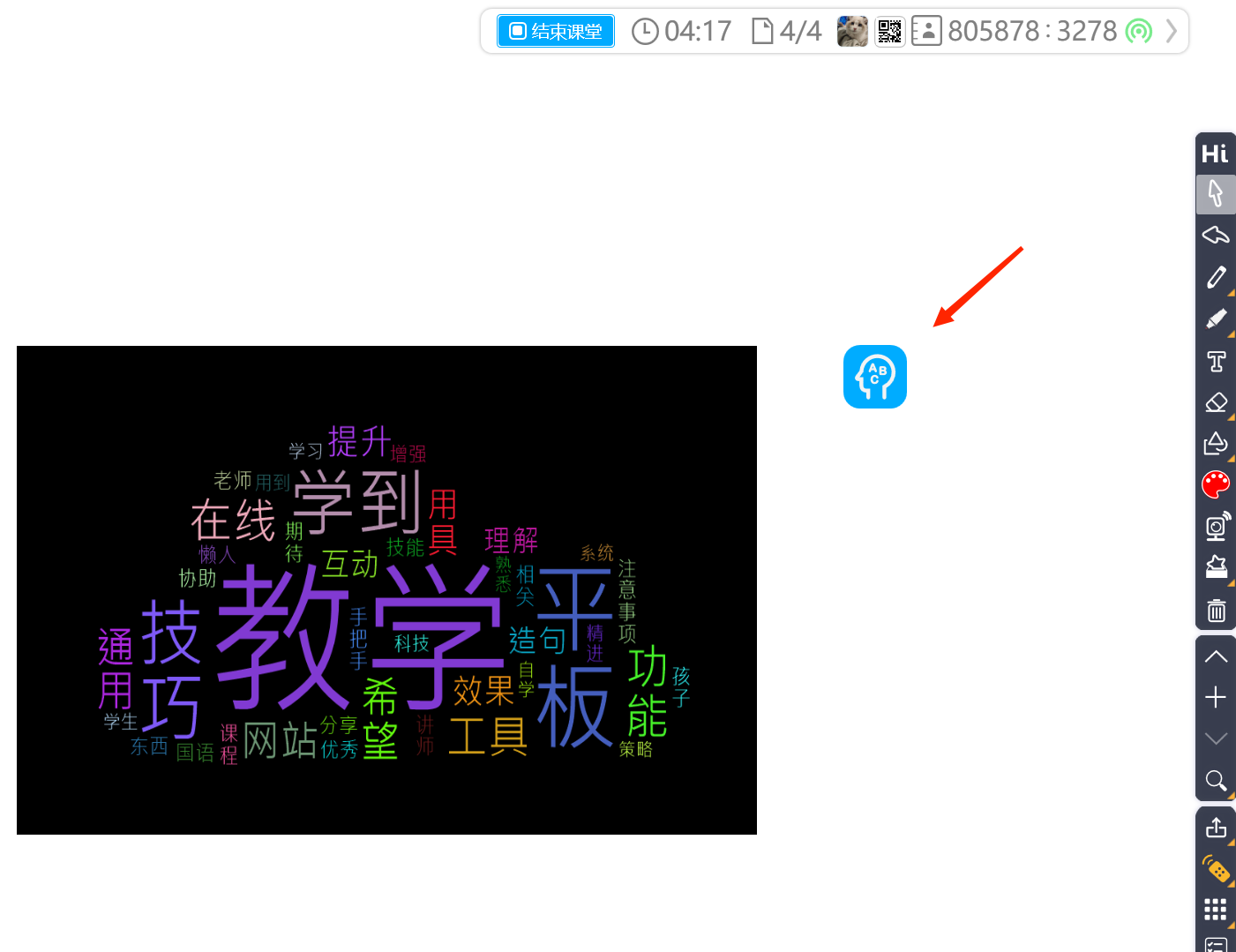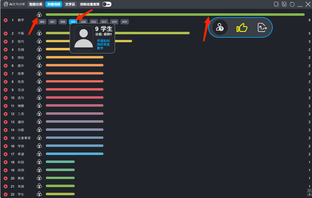 4.點選關鍵詞頻標簽,會顯示關鍵詞的出現(xiàn)頻次統(tǒng)計長條圖,以及數(shù)量。點選翻牌功能,會顯示用到這個關鍵詞的學生,點選號碼可顯示這位學生的詞句內容;若點選長條圖,則可以進行智慧挑人或為本詞句包含的學生加分。