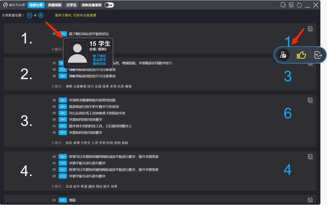 3.隨即顯示AI文句分析視窗,顯示AI分析整理的結果。預設顯示智慧分類標簽,可以看到自動分類的詞句,以及每個類別的數(shù)量。點選號碼,可以查看該位學生的詞句內容,點選類別總數(shù)的部分,則可以進行智慧挑人(從選擇該分類的號碼中挑人)或者加分。