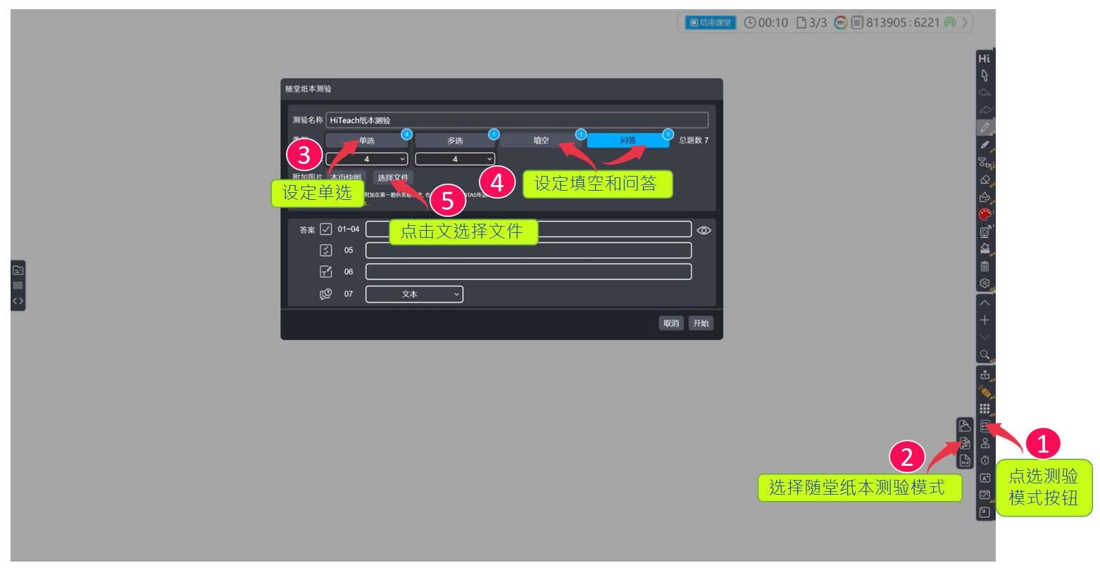 點(diǎn)選測(cè)驗(yàn)?zāi)J解o,再點(diǎn)選隨堂紙本測(cè)驗(yàn),出現(xiàn)隨堂紙本測(cè)驗(yàn)視窗后,設(shè)定單選題、填充題、問答題題數(shù),然后點(diǎn)選選擇檔案鈕。