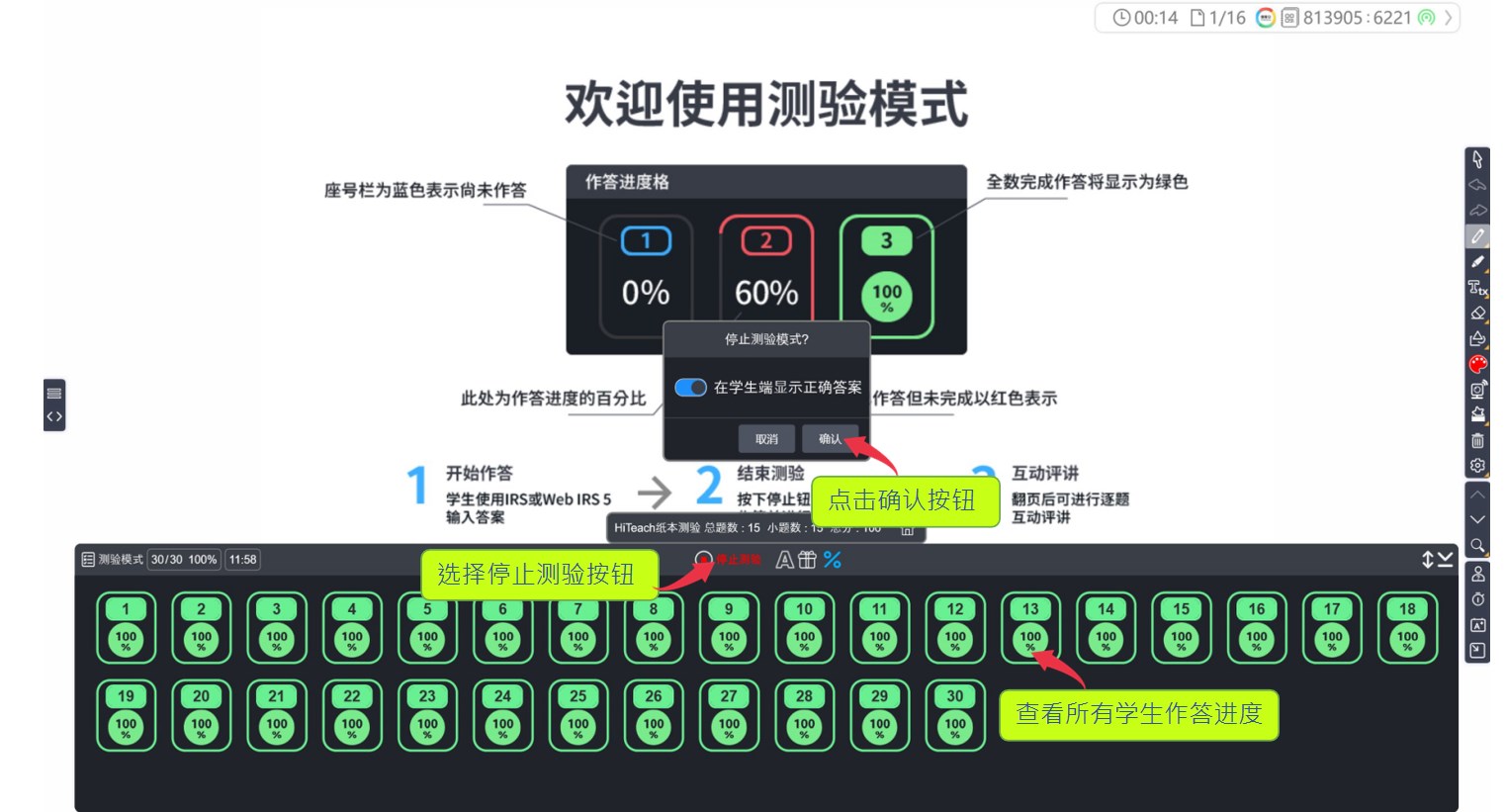 老師端的HiTeach上可以查看學(xué)生作答的進(jìn)度,所有學(xué)生作答完成或到達(dá)停止作答時(shí)間時(shí),點(diǎn)選停止測(cè)驗(yàn)鈕,出現(xiàn)提示視窗后,點(diǎn)選確認(rèn)鈕。系統(tǒng)會(huì)提示試卷包含主觀題,需以交換改或者由老師在線批閱給分后,才能計(jì)算完整成績(jī),學(xué)生課后也才能檢視與復(fù)習(xí)。此外,老師也可以決定停止測(cè)驗(yàn)后學(xué)生端是否要顯示批改的答案。