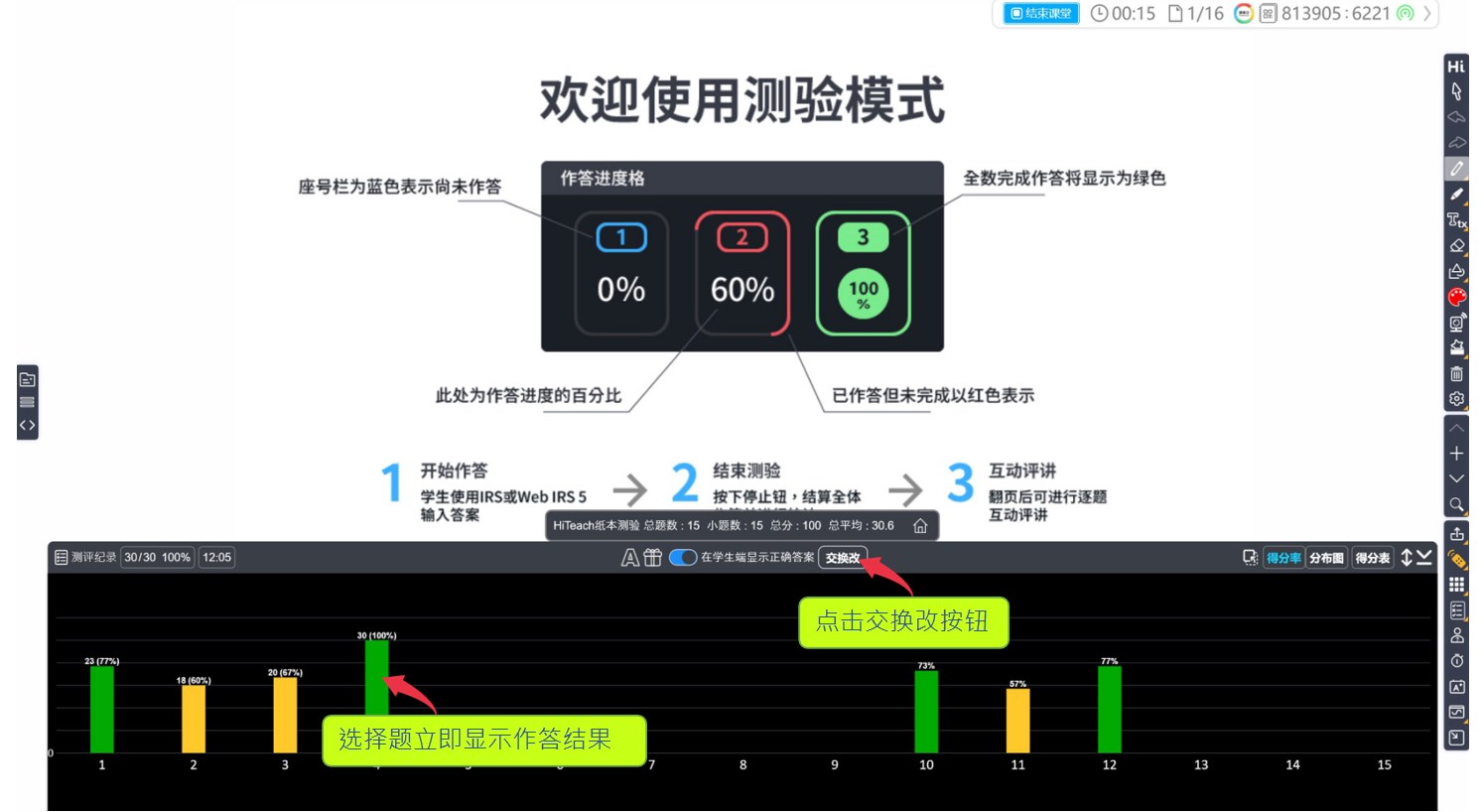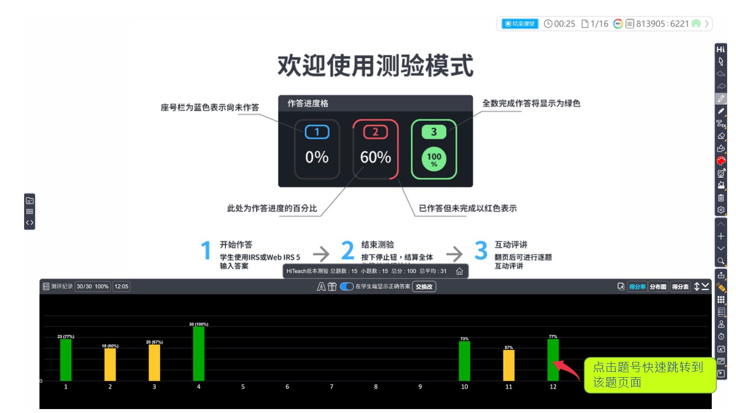 評(píng)量得分統(tǒng)計(jì)會(huì)立即更新統(tǒng)計(jì)結(jié)果,分析圖表、全班試卷得分、與成績(jī)結(jié)算,更重要的是,教師可以根據(jù)分析圖表挑選試題難點(diǎn)和重點(diǎn),進(jìn)一步進(jìn)行互動(dòng)講評(píng)分析,促進(jìn)學(xué)習(xí)效果。例如,老師可根據(jù)答題情況較差的部分進(jìn)行講解說(shuō)明,方法是點(diǎn)選題號(hào),隨即跳到該題號(hào)所在頁(yè)面。
