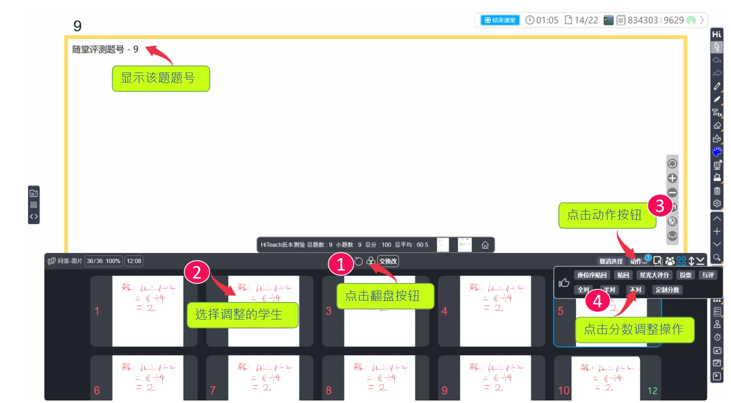 若有需要調(diào)整該題號(hào)個(gè)別學(xué)生的分?jǐn)?shù),也可以在此頁(yè)面中,點(diǎn)選翻牌鈕,再點(diǎn)選需要調(diào)整的學(xué)生,接著點(diǎn)選動(dòng)作鈕,然后進(jìn)行分?jǐn)?shù)調(diào)整操作。