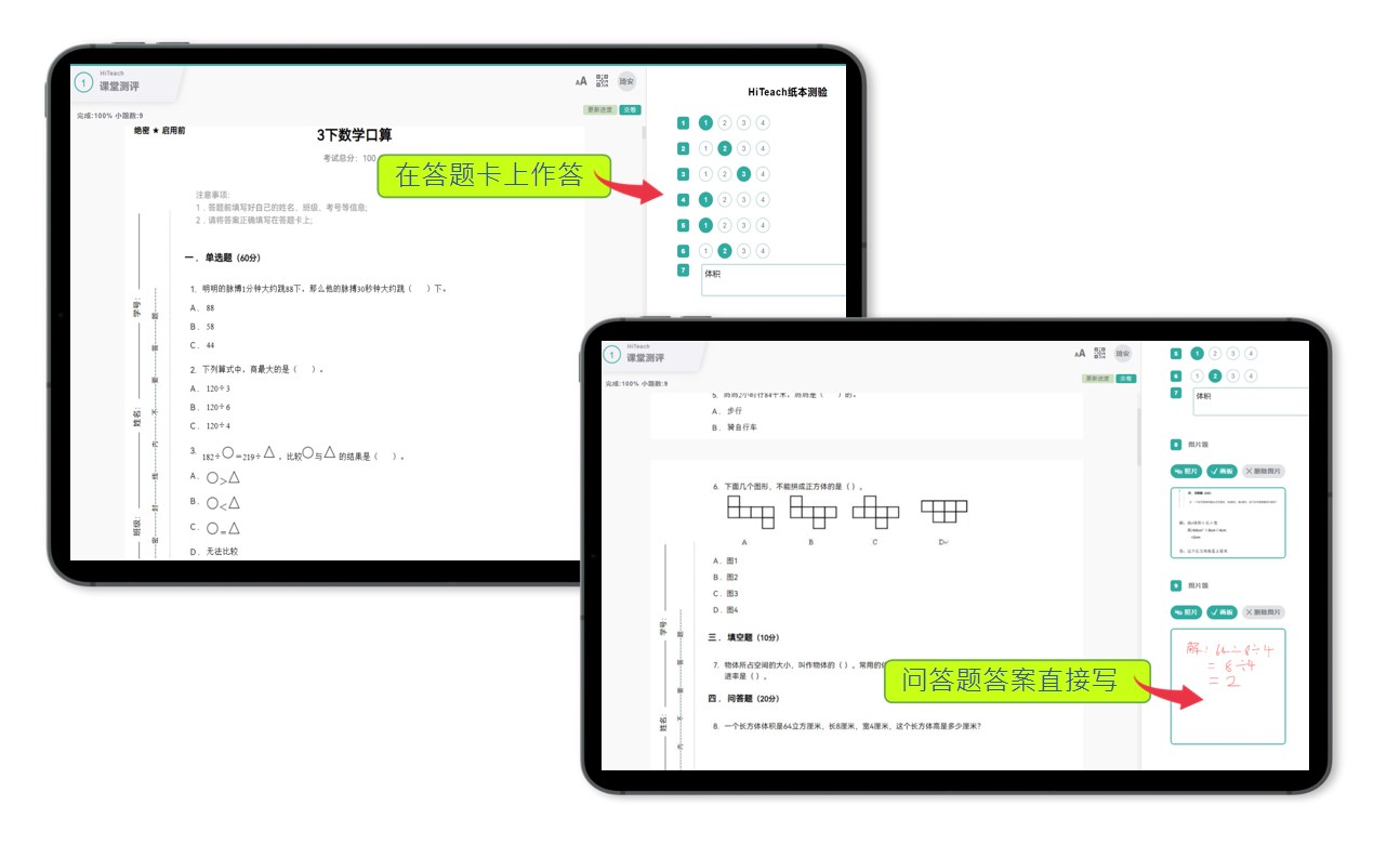 接下來(lái),學(xué)生端的平板計(jì)算機(jī)上就會(huì)出現(xiàn)這次測(cè)驗(yàn)的試卷,以及答題卡,開始進(jìn)行答題操作,問答題的答案可以寫在紙上,然后拍照,或者利用畫板,直接在平板上書寫,最后點(diǎn)選交卷鈕。