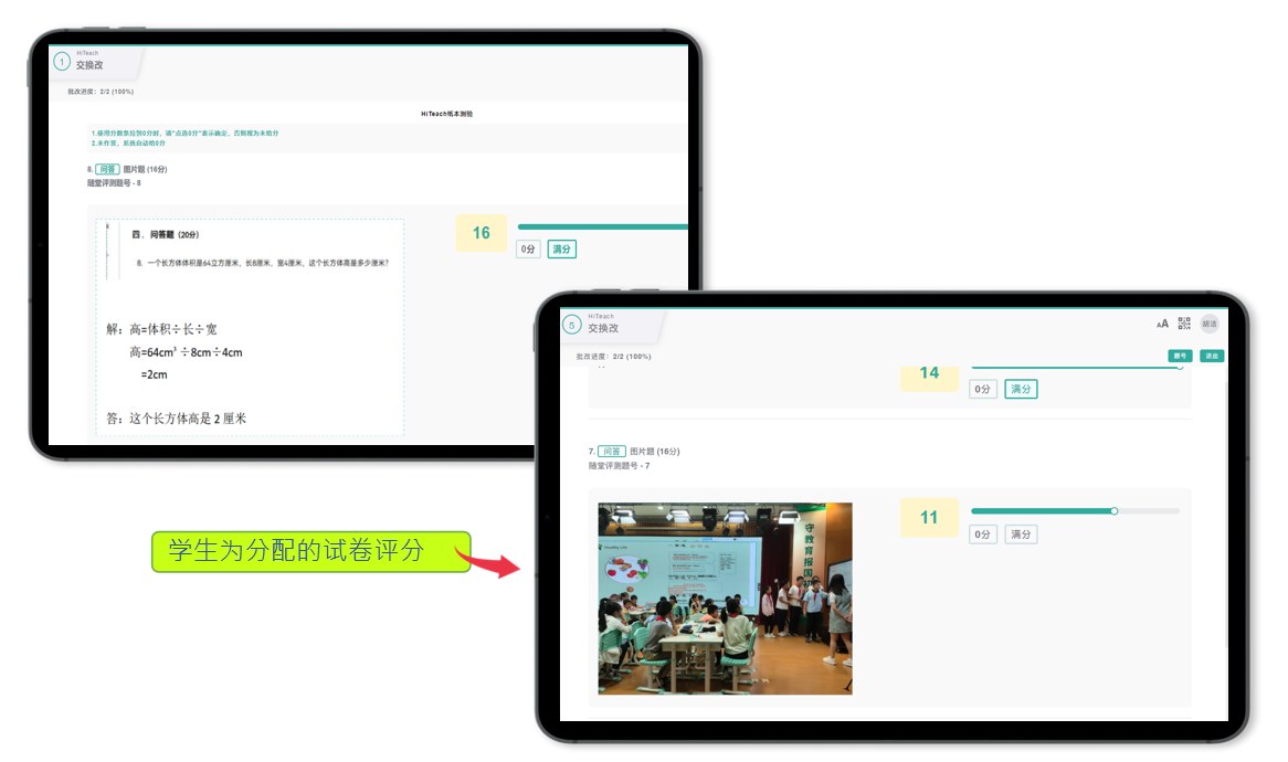 HiTeach「試卷交換改」是測(cè)驗(yàn)?zāi)K和智慧評(píng)分模塊的組合應(yīng)用,按下試卷「交換改」鈕,設(shè)定一人一件、一人兩件或一人多件等分配方式后,就能立即派送到學(xué)生平板計(jì)算機(jī)上,由非本人批改試卷填充和問答題,根據(jù)教師公布的批改規(guī)準(zhǔn)、答案示例給分。