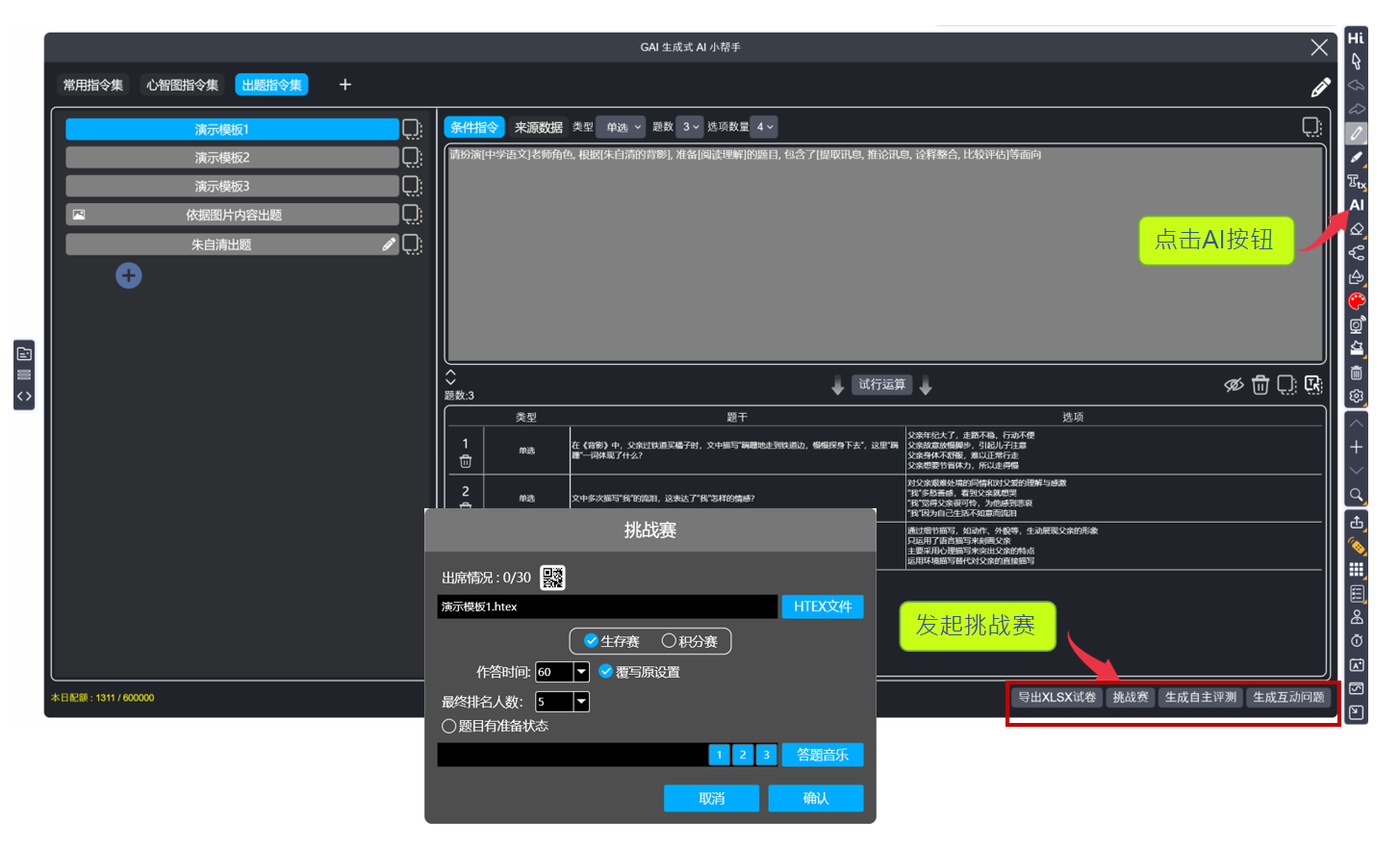 點擊AI鈕,利用GPT生成式AI小幫手下好條件指令,AI隨即快速出題,點擊挑戰(zhàn)賽鈕便可開始進行。