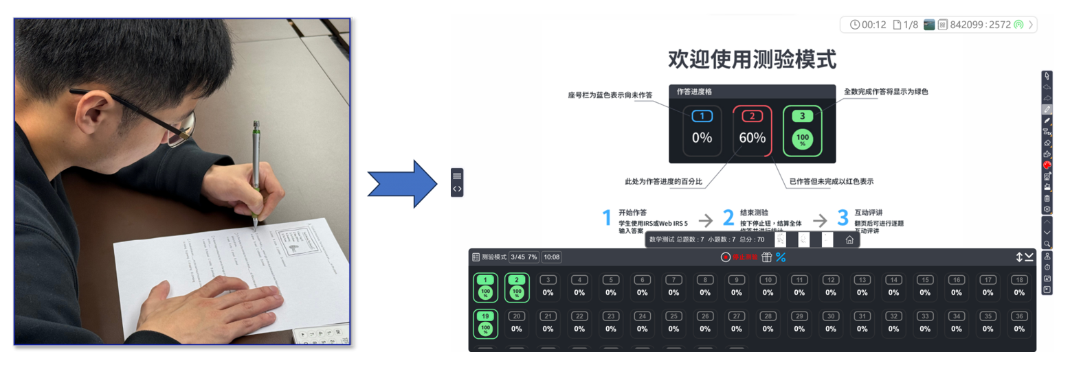 學生先紙本作答,然后用IRS反饋器逐題輸入答案,測驗結(jié)束,老師便可基于統(tǒng)計數(shù)據(jù),檢查學習成效,成績也統(tǒng)計好了!