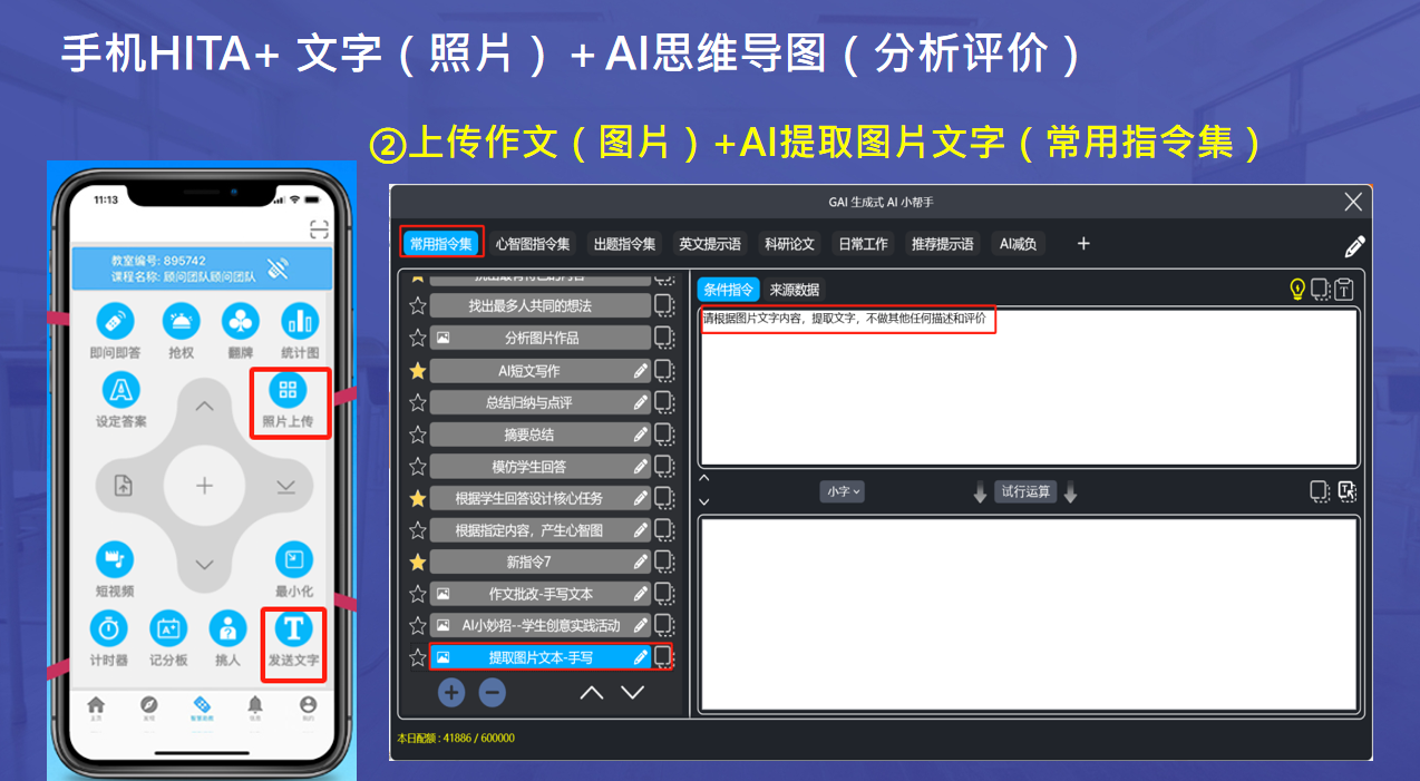 老師通HiTA上傳照片或發(fā)送文字,并設(shè)置生成式AI指令集,生成式AI即可針對圖片、文字進行分析,幫助老師快速整理圖文信息。