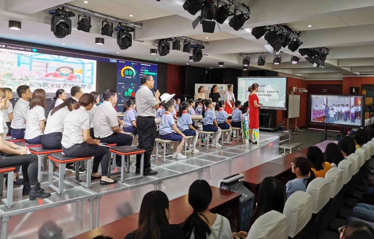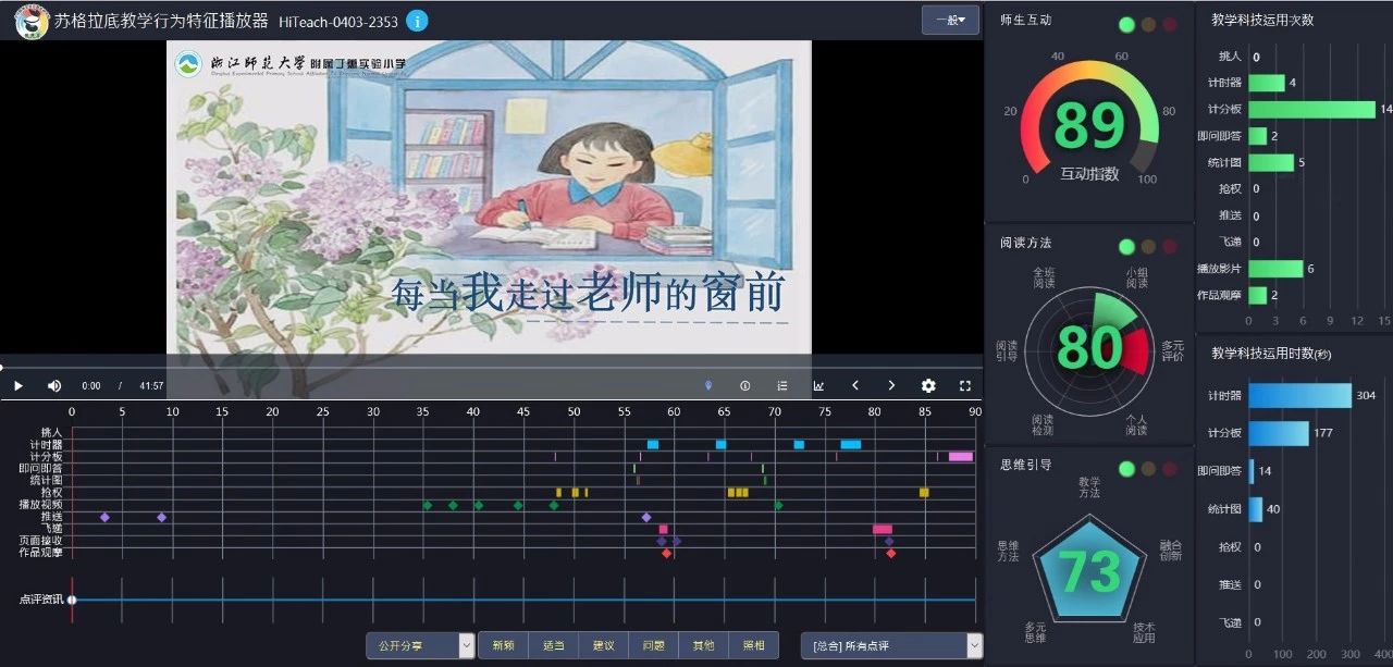 此次課堂展示由學校的三位新老師和師范生運用醍摩豆智慧教室系統(tǒng)共同合作完成了一堂跨越語文、音樂、美術三種學科的智慧課。 在智慧課堂教學過程中,三位老師運用HiTeach軟件、IRS反饋器等信息化設備展示了一堂精彩紛呈的高互動課堂。現(xiàn)場觀摩嘉賓及遠程聽課專家在線評課議課、打點標記,將產生的教學筆記數(shù)據(jù)、課堂實錄及時上傳至AI蘇格拉底平臺,提供了教學教研的數(shù)據(jù)憑證。 課堂教學結束后,浙江師范大學附屬丁蕙實驗小學校長吳樹超通過遠程直播的方式向書記解讀了教學后產生的蘇格拉底影片及報告。 同時,吳校長希望老師們在教學過程中運用蘇格拉底影片記錄教學過程,進行智慧教研,形成教學教研新模式,讓蘇格拉底平臺成為教師專業(yè)成長的好教練、發(fā)展智慧學校的好見證。