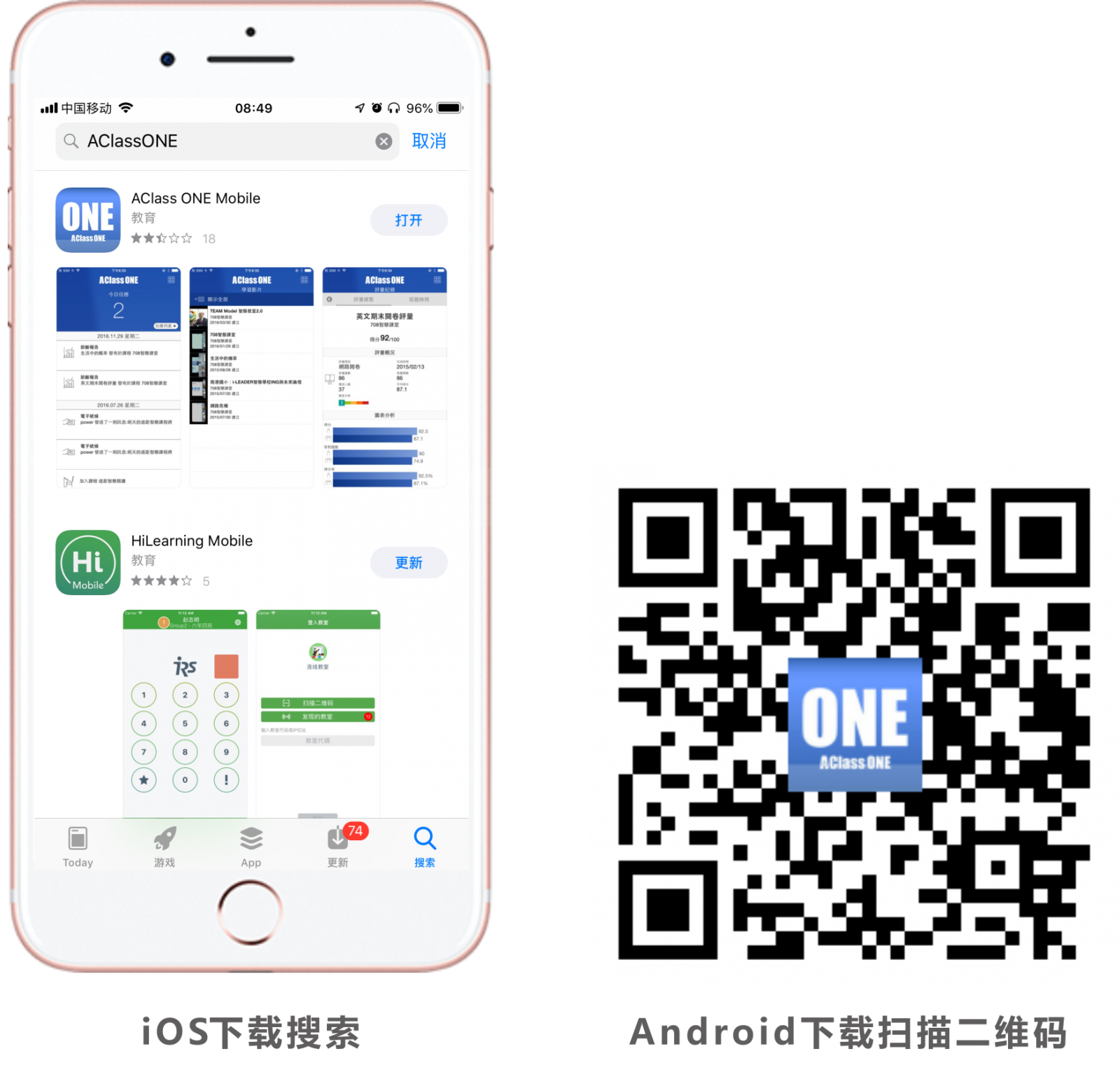 1、使用個(gè)人手機(jī),下載App "AClassONE智慧學(xué)伴"。iOS系統(tǒng)直接在AppStore搜索下載,Android系統(tǒng)用微信掃描以下二維碼,在瀏覽器中復(fù)制鏈接進(jìn)行下載。