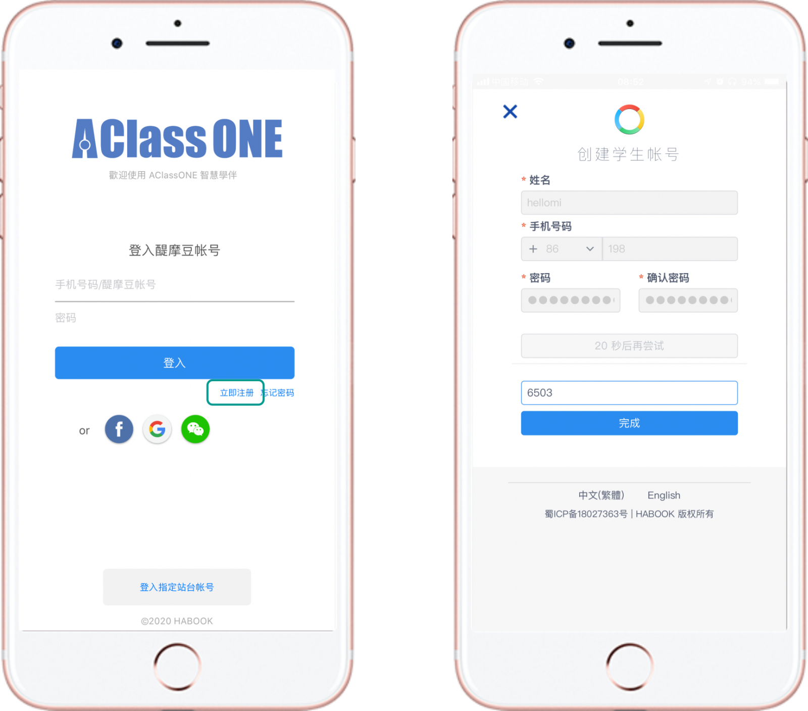 2、點(diǎn)擊AClassONE智慧學(xué)伴App,點(diǎn)擊 立即注冊(cè),輸入姓名、手機(jī)號(hào)碼、密碼和發(fā)送驗(yàn)證碼。輸入驗(yàn)證碼后,點(diǎn)擊完成按鈕。