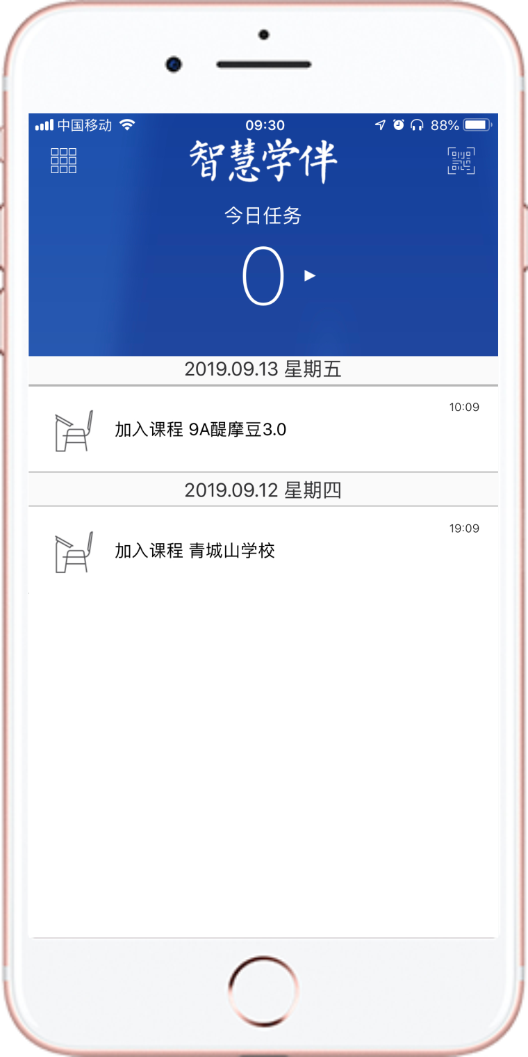 3、進(jìn)入App主頁后 ,點(diǎn)擊右上角二維碼圖標(biāo),掃描課程二維碼或點(diǎn)擊輸入代碼,輸入課程邀請(qǐng)碼,即可加入課程。(課程邀請(qǐng)碼請(qǐng)老師提供,由“大寫字母C+6位數(shù)字”組成)。