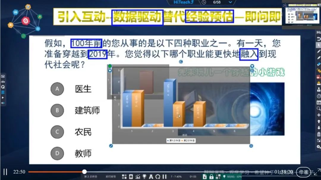 老師們運用手機進行選擇回答,回答結(jié)束后産生的數(shù)據(jù)圖表則作為主講老師的參考依據(jù),