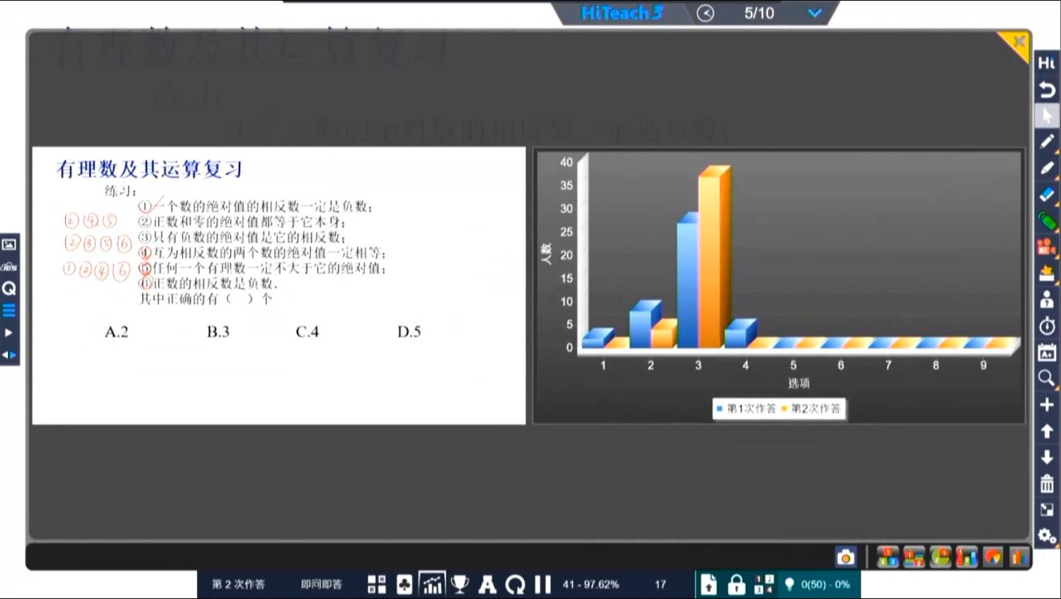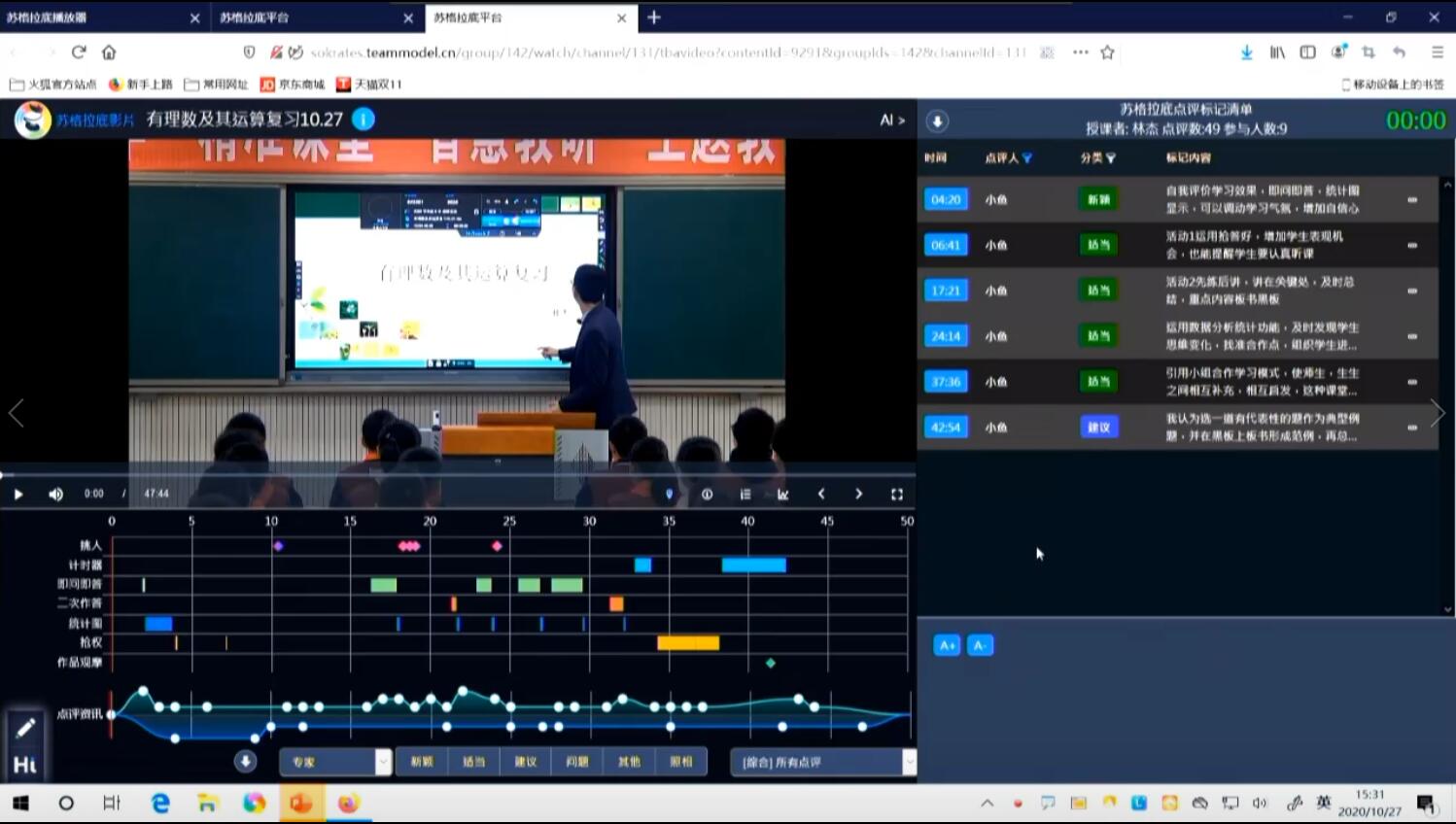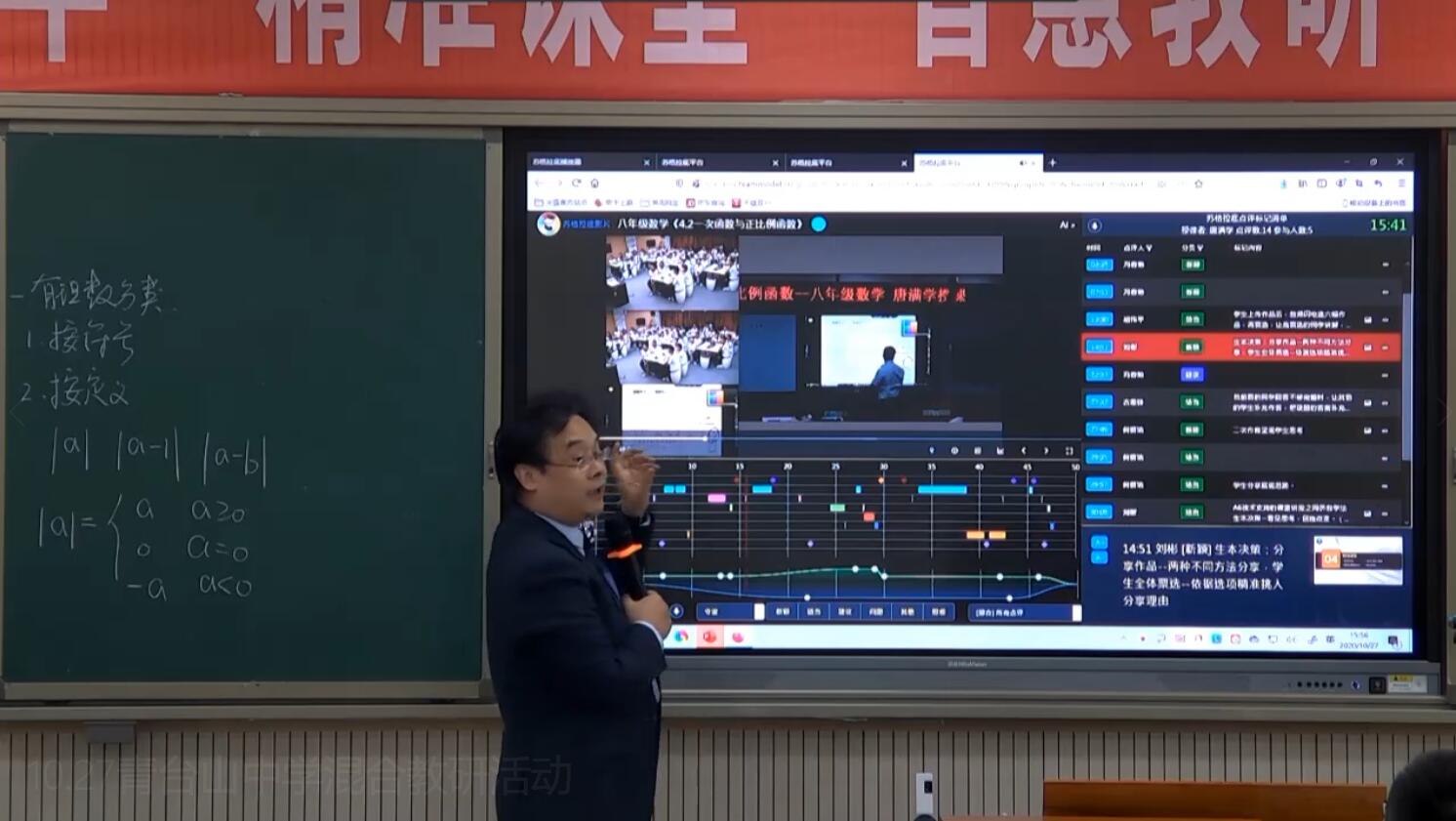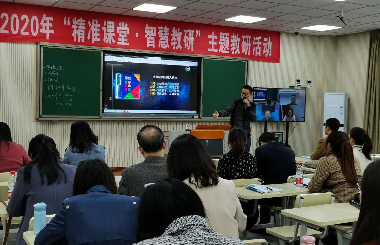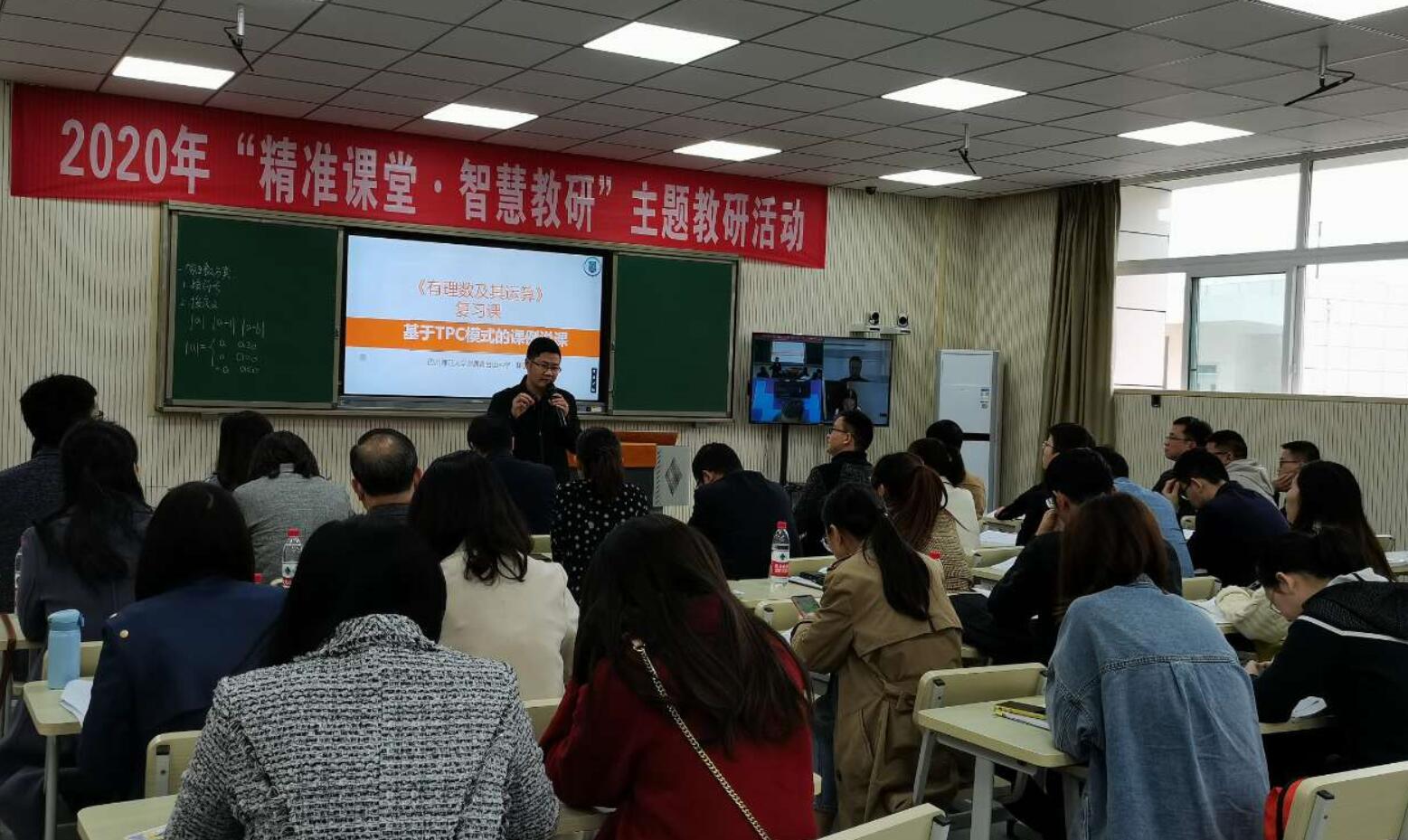 10月27日下午,由《中國教育學刊》四川學用刊中心、全球醍摩豆智慧教育研究院聯(lián)合四川師范大學附屬青臺山中學等單位共同舉辦的“2020年‘精準課堂,智慧教研’”主題研討活動在四川師范大學附屬青臺山中學如期舉行,活動旨在更好地促進大數(shù)據(jù)環(huán)境下的智慧學校發(fā)展,開展智慧教育實踐與理論相結合的教育教學模式、互學互鑒。 首先,四川師范大學附屬青臺山中學林杰老師和七年級6班的孩子們帶來了精彩的數(shù)學智慧復習課——《有理數(shù)及其運算》。因為是復習課,林杰老師首先運用IRS反饋器收集學生課前預習的學習情況,再隨后的隨堂檢測中,林杰老師布置了十余道數(shù)學復習題,在復習題的解答過程中,老師及時抓住教學契機,將即問即答、二次作答、作品觀摩、智慧挑人等信息化技術手段有效融入課堂,引導學生獨立思考和互動交流。同時,搶權、倒計時等小工具的運用大大激發(fā)了學生學習熱情。課后林杰老師基于TPC模式進行說課,在生本理念下,關注學習與TPC技術的融合運用。從新技術、新教法、新教材等方面進行詳細的闡述。
