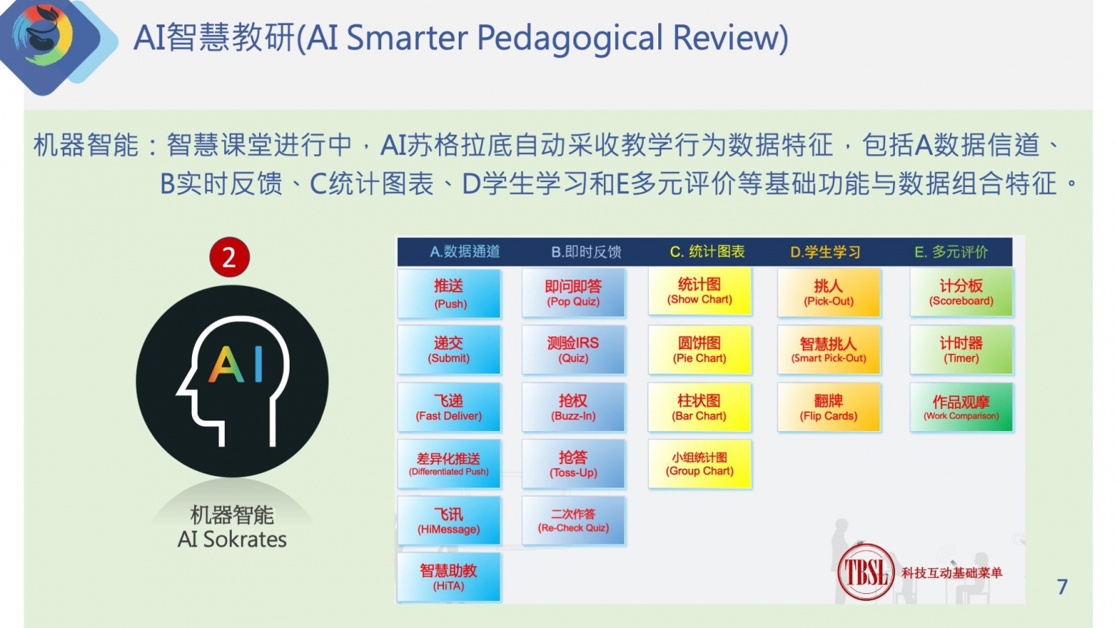 機(jī)器智能:智慧課堂進(jìn)行中,AI蘇格拉底自動(dòng)采收教學(xué)行為數(shù)據(jù)特征,包括A數(shù)據(jù)通道、B即時(shí)反饋、C統(tǒng)計(jì)圖表、D學(xué)生學(xué)習(xí)和E多元評(píng)價(jià)等基礎(chǔ)功能與數(shù)據(jù)組合特征。