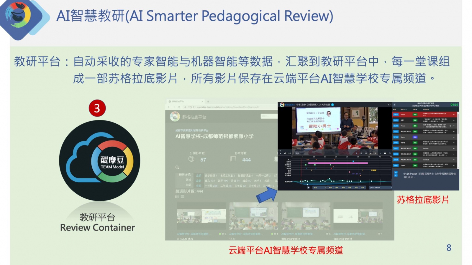 教研容器:自動(dòng)采收的專家智慧與機(jī)器智能等數(shù)據(jù),匯聚到教研容器中,每一堂課組成一部蘇格拉底影片,所有影片保存在云端平臺(tái)AI智慧學(xué)校專屬頻道。