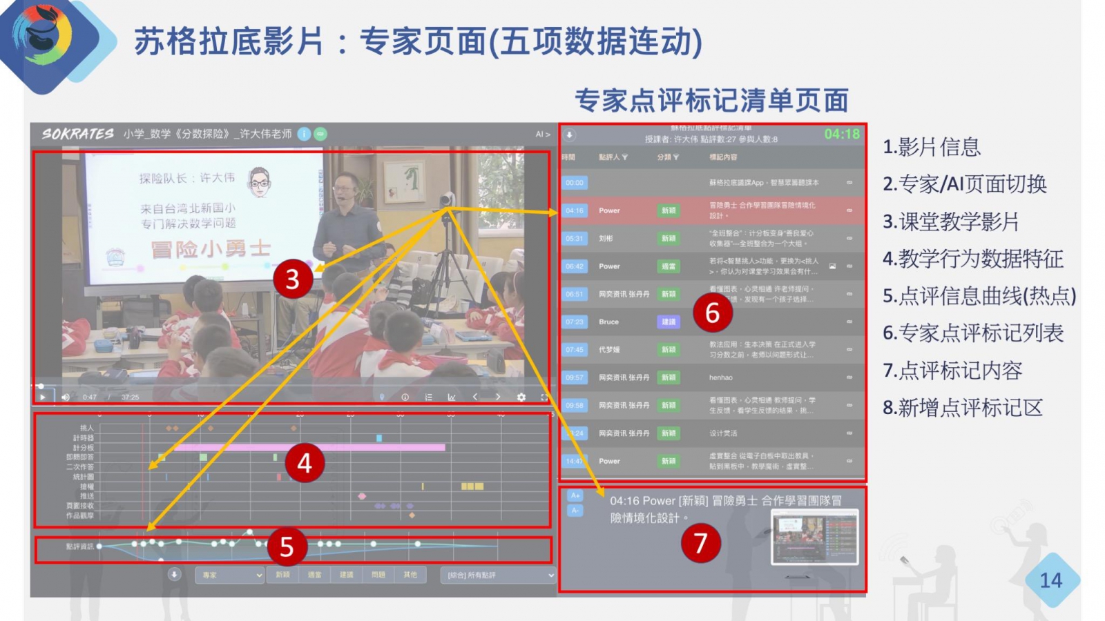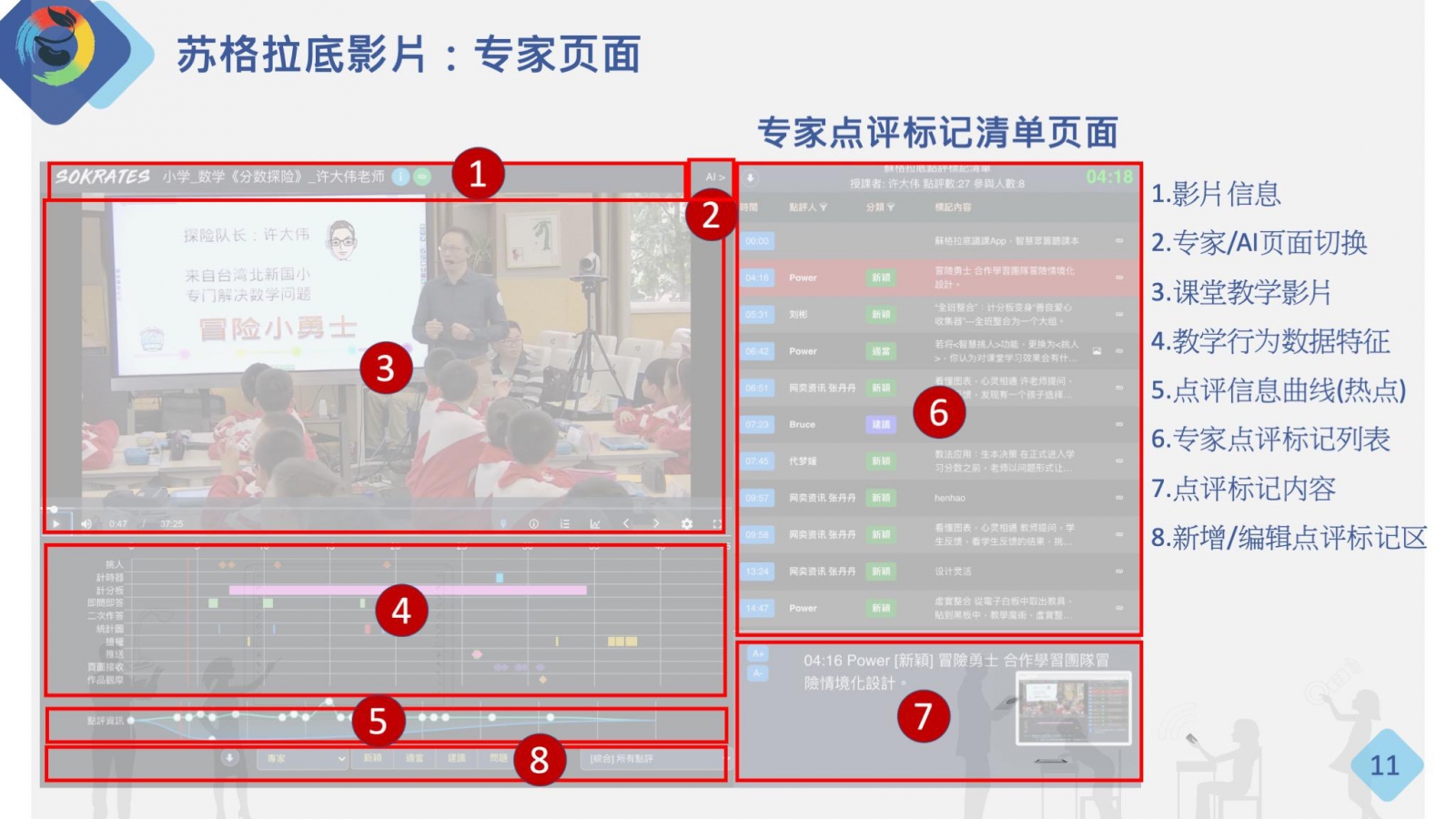 蘇格拉底影片之專家點(diǎn)評(píng)標(biāo)記清單頁(yè)面,可分為1.影片資訊,2.專家/AI頁(yè)面切換,3.課堂教學(xué)影片,4.教學(xué)行為數(shù)據(jù)特征,5.點(diǎn)評(píng)資訊曲線(熱點(diǎn)),6.專家點(diǎn)評(píng)標(biāo)記清單,7.點(diǎn)評(píng)標(biāo)記內(nèi)容,8.新增/編輯點(diǎn)評(píng)標(biāo)記區(qū)等八個(gè)區(qū)域。