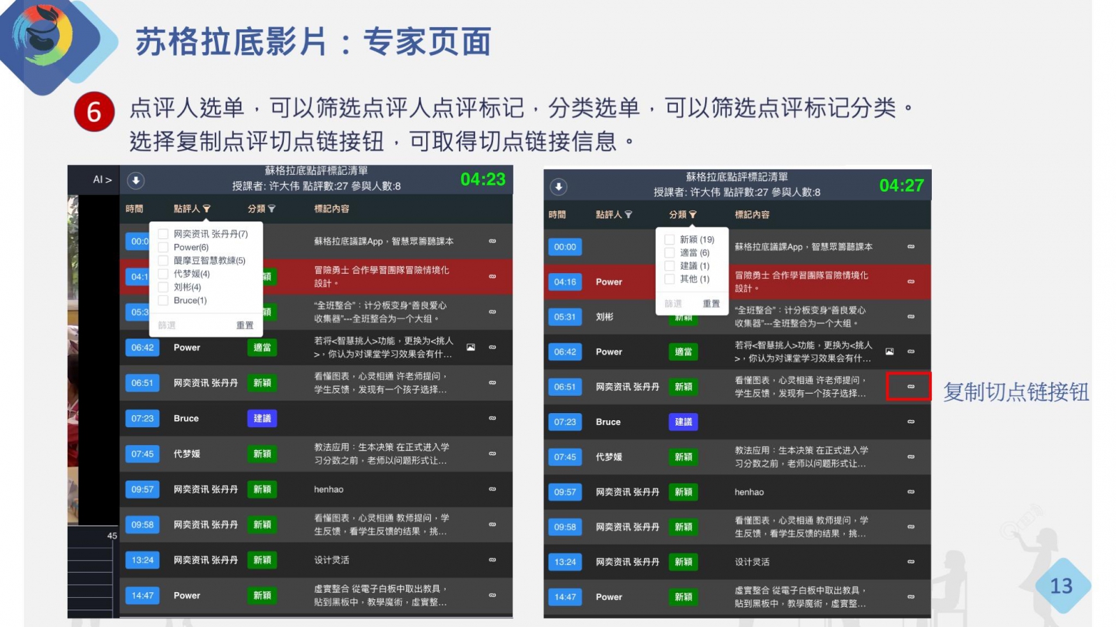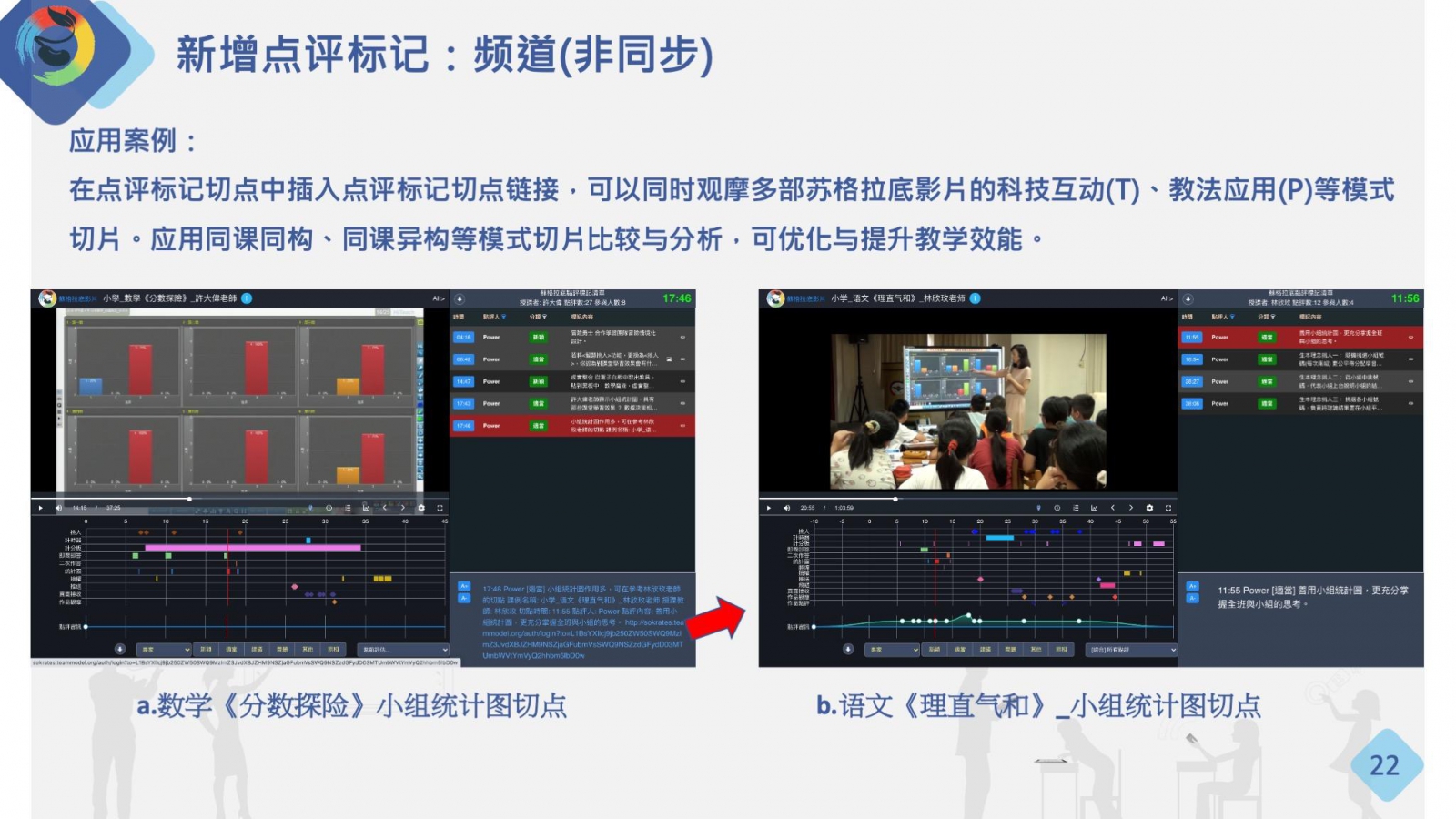在點(diǎn)評(píng)標(biāo)記切點(diǎn)中插入點(diǎn)評(píng)標(biāo)記切點(diǎn)鏈接,可以同時(shí)觀摩多部蘇格拉底影片的科技互動(dòng)(T)、教法應(yīng)用(P)等模式切片。應(yīng)用同課同構(gòu)、同課異構(gòu)等模式切片比較與分析,可優(yōu)化與提升教學(xué)效能。