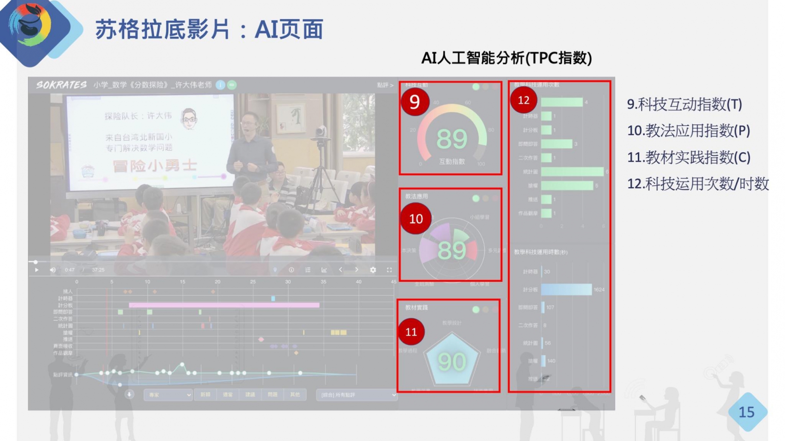 蘇格拉底影片AI頁(yè)面,可分為9.科技互動(dòng)指數(shù)(T)、10.教法應(yīng)用指數(shù)(P)、11.教材實(shí)踐指數(shù)(C)、12.科技運(yùn)用次數(shù)/時(shí)數(shù)等數(shù)據(jù)。