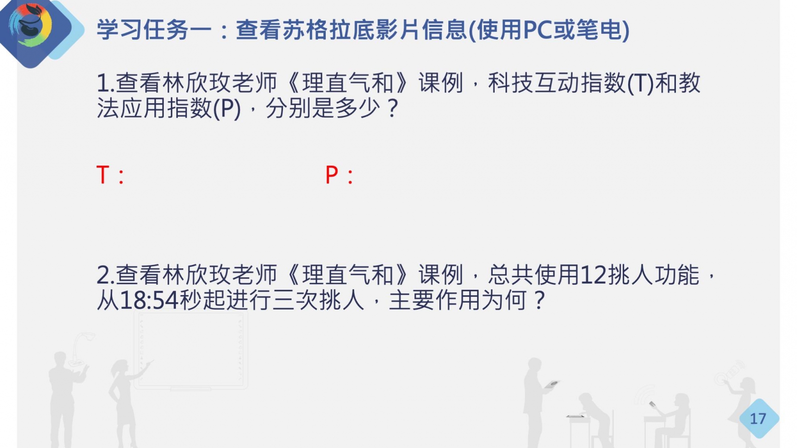 1.查看林欣玫老師《理直氣和》課例,科技互動(dòng)指數(shù)(T)和教法應(yīng)用指數(shù)(P),分別是多少?