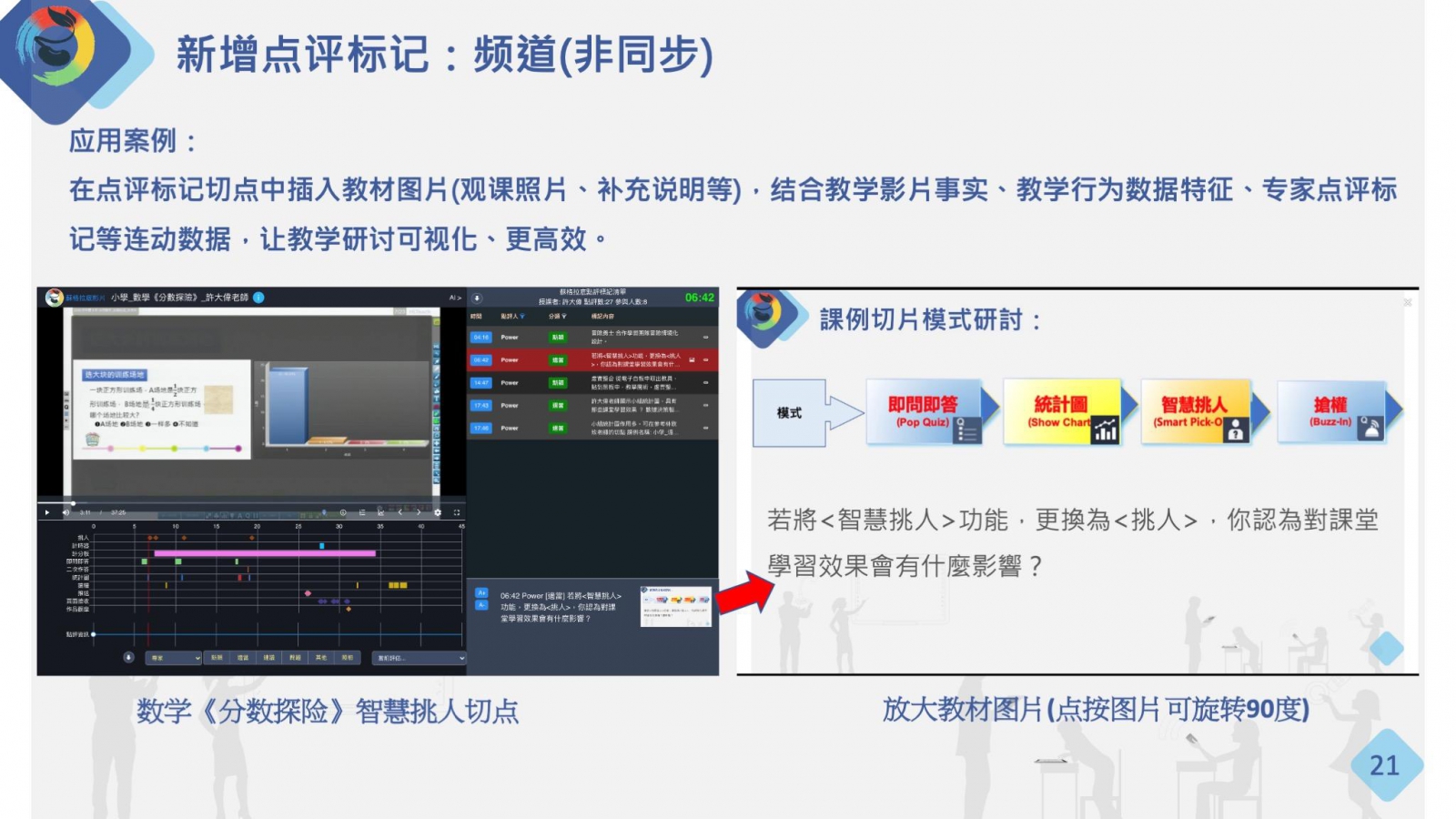在點(diǎn)評(píng)標(biāo)記切點(diǎn)中插入教材圖片(觀課照片、補(bǔ)充說明等),結(jié)合教學(xué)影片事實(shí)、教學(xué)行為數(shù)據(jù)特征、專家點(diǎn)評(píng)標(biāo)記等連動(dòng)數(shù)據(jù),讓教學(xué)研討可視化、更高效。